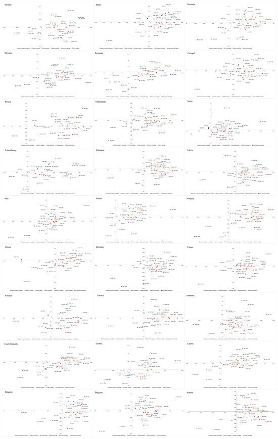 Figure 2 and Figure 3 show the overall decoupling trends of the EU and BRICS countries, respectively, while Figure 4 and Figure 5 show the decoupling trends of each of the 27 EU member states and the 5 BRICS countries, respectively. We observe from both the overall and individual country dimensions. The horizontal axis represents the rate of change in economic output, the vertical axis represents the rate of change in carbon emissions, and the points in the figures indicate the decoupling status in a given year.