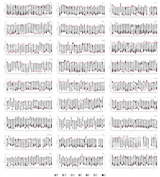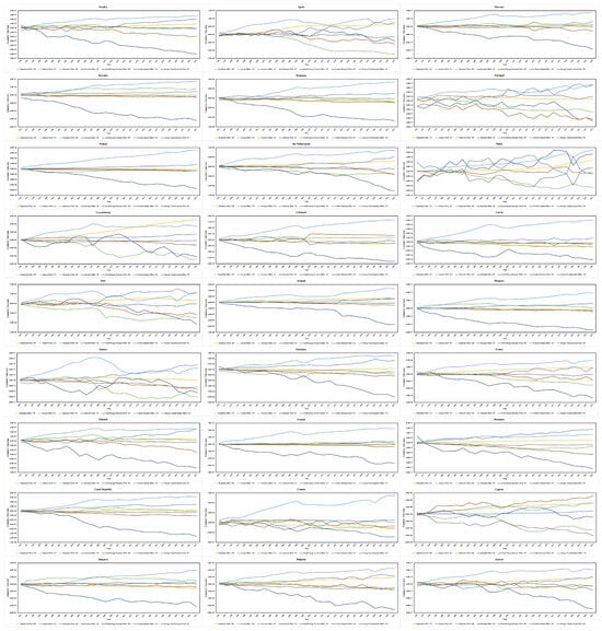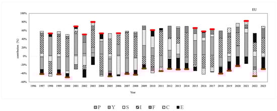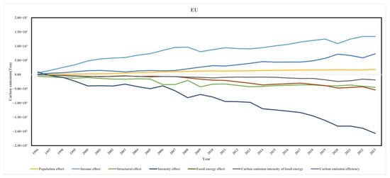 Figure 6 and Figure 7 illustrate the contribution of carbon emission driving factors and the cumulative effects for the EU as a whole, respectively. Figure 8 and Figure 9 present the corresponding charts for individual EU member states. The contribution charts clearly show the extent to which each factor influences changes in carbon emissions, while the cumulative effect charts reflect the long-term impact trends of these factors.