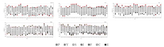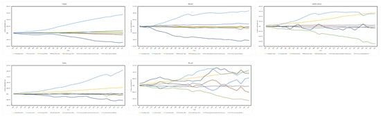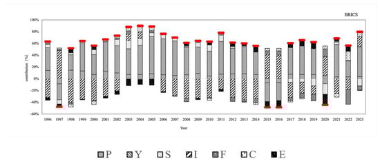 Figure 10 and Figure 11 illustrate the contribution of carbon emission driving factors and the cumulative effects for the BRICS as a whole, respectively. Figure 12 and Figure 13 present the corresponding charts for individual BRICS member states.
