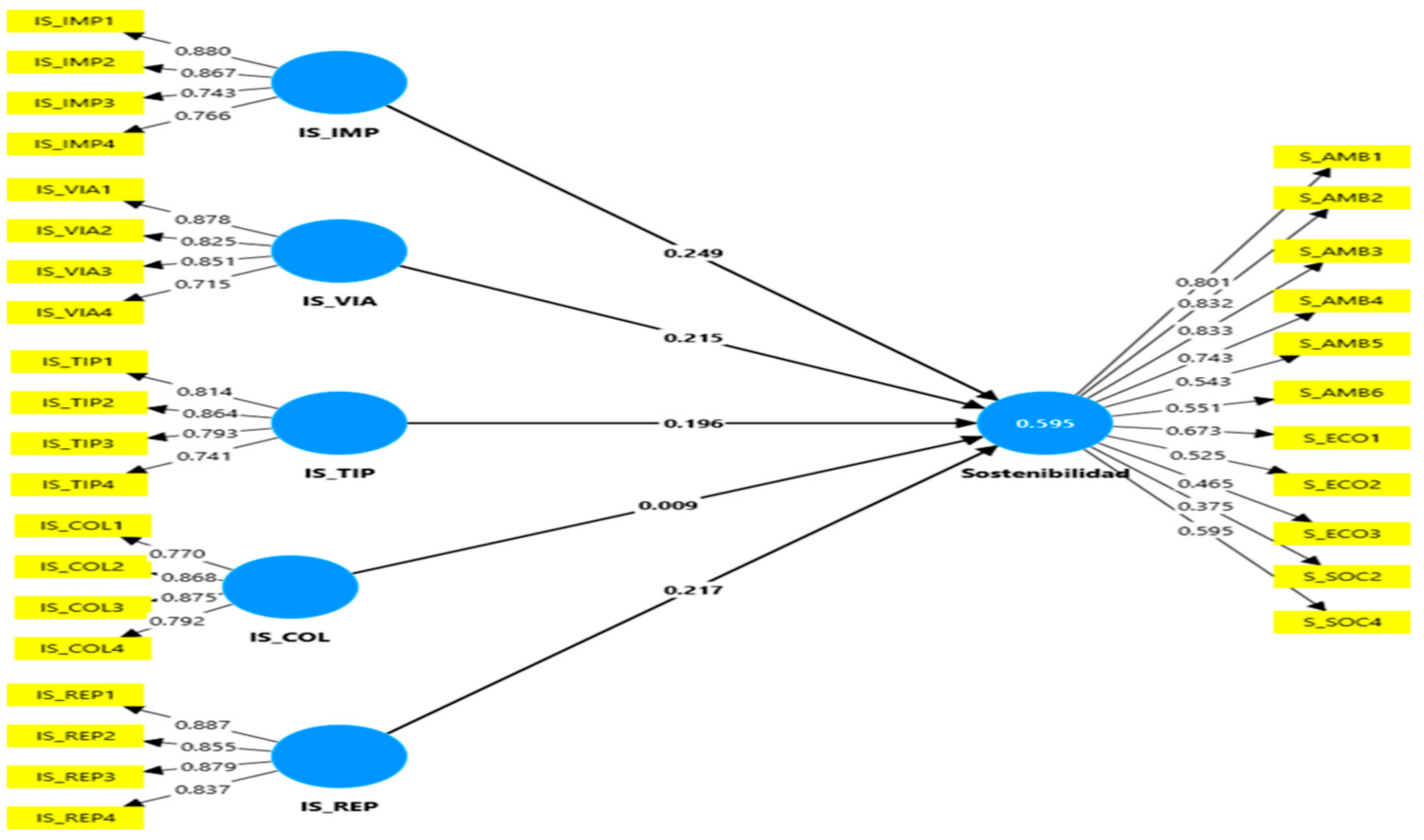 Figure 3, the structural model is presented. The model explains 59.5% of the variance in sustainability. It is classified as reflective, as the latent variable acts as the cause of the observed measures [