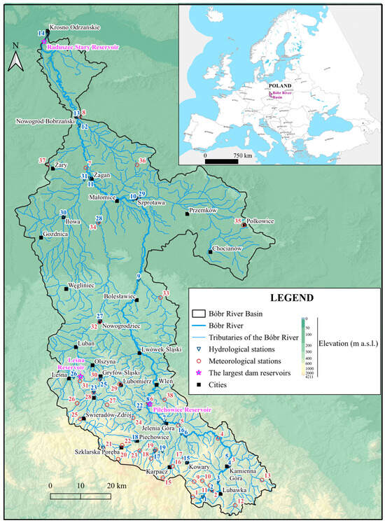 Location of hydrological and meteorological stations and characteristic points in the Bóbr River Basin area (location of stations according to Hydro IMGW-PIB; https://hydro.imgw.pl/ (accessed on 20 October 2025; map base: https://www.mapsforeurope.org/explore-map/euro-dem (accessed on 20 October 2025)).