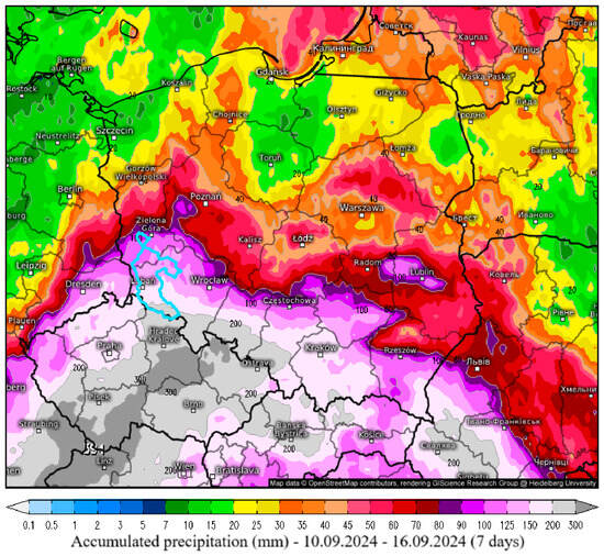 Total accumulated precipitation in Poland for the period 10 September 2024–16 September 2024 with the Bóbr river basin area marked (Reprinted with permission from Ref. [55]. Copyright 2025 Miriam Kachelmann.