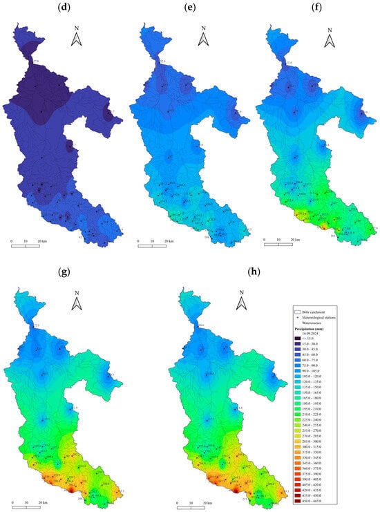 Cumulative rainfall in the Bóbr River Basin area: (a) 9 September 2024, (b) 10 September 2024, (c) 11 September 2024, (d) 12 September 2024, (e) 13 September 2024, (f) 14 September 2024, (g) 15 September 2024, (h) 16 September 2024.