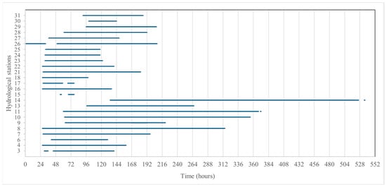 The course of the flood was also monitored hour by hour, marking the warning and alert levels at all stations in the period under study. The beginning and end of the flood were also determined at each station, also taking into account the longest, continuous duration (i.e., without a drop in water level below the warning level).