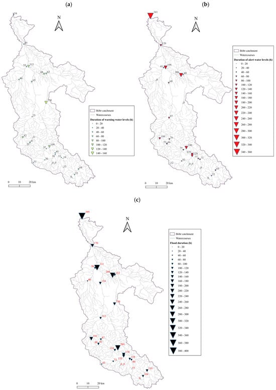 The total duration of the flood (Figure 6c), which is one of the criteria for determining the scale of the flood in the article, was the highest in stations 14, 11, 10 and 8 (395, 311, 294 and 289 h, respectively). Translated to the adopted scale from 0 to 10, this is 9.99, 7.89, 7.44 and 7.31 h, respectively, which is a significant duration of the flood (higher than 5.0). It is worth mentioning that if the duration of alert levels were to be adopted as the criterion for the duration of the flood, the four stations with the longest duration would remain unchanged; only the order would change (swapping 11 and 10).