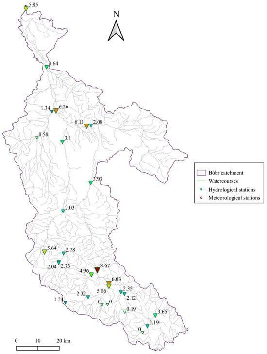 The Bóbr River Basin area, located in the southwestern part of Poland and partly in the northern Czechia (Central Europe), was selected as the study area, with 99.2% of its area located within the borders of Poland. The basin area is 5876 km2 and the average gradient is about 0.3%. The source is located at an altitude of 780 m above sea level (m a.s.l.) in the Karkonosze Mountains (Bobrowy Stok), and the mouth is at an altitude of 38.1 m a.s.l., near Krosno Odrzańskie. The basin is part of the Upper Odra River basin and belongs to the Baltic Sea drainage basin area [49]. The main river is the Bóbr (272 km long), and the largest tributaries are the Kwisa, Czerna Wielka, Szprotawa and Kamienna (>30 km long). The largest share in the land use structure is forests (44.8%), agricultural land (24.1%) and grasslands (18.3%). It is an area with a low degree of urbanization (2.73% of the area) [50]. The nature of the flow, expressed by the specific discharge (the ratio of the average flow from the multi-year period to the basin area), shows that the streams in most of the Bóbr River Basin belong to the hydrological mountain or transitional/foothill type (division according to Kostrzewa’s method) [51]. The area lies in the temperate transitional warm climate zone (there is seasonal variability depending on the season, with the lowest temperatures in winter and the highest in summer). For example, the average annual air temperature for the Jelenia Góra station in the period 1981–2022 was 7.95 °C, while the average annual precipitation in this period was 686.7 mm [40]. According to the Kondracki regionalization, the Bóbr River Basin area belongs to the following macroregions: Western Sudetes, Central Sudetes, Western Sudeten Foothills, Silesian–Lusatian Lowland, Trzebnicki Rampart, Milicko–Głogowskie Depression, Zielona Góra Heights [52]. Figure 2 shows the location of the Bóbr River Basin area with marked hydrological and meteorological stations, based on which the analysis of the 2024 flood in this area was made, as described below.
