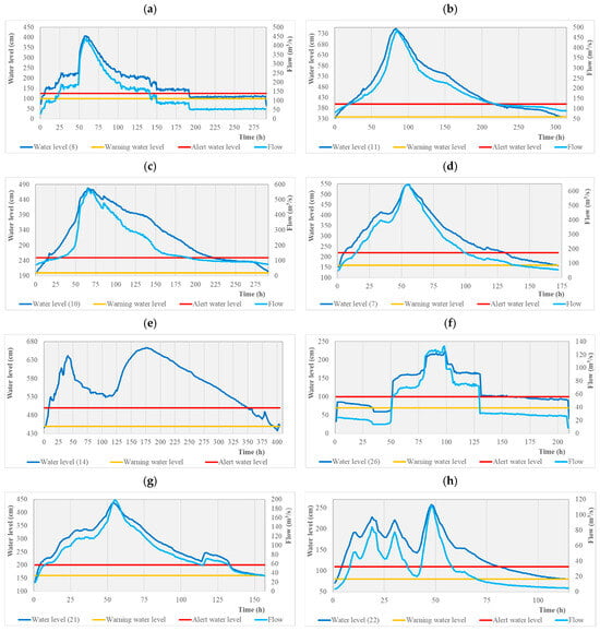 The flood wave peak was from 223 cm (station 26; Figure 9f) to 755 cm (station 11; Figure 9b). The average was 471 cm. In terms of maximum flows, it was from 112 m3/s (station 22; Figure 9h) to 648 m3/s (station 7; Figure 9d), with an average of 369.71 m3/s. The order of maximum levels and flows, therefore, differs between stations.