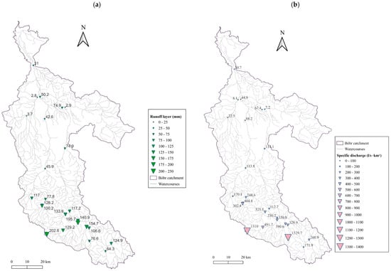 Runoff measures in the Bóbr River Basin area during the 2024 flood: (a) runoff layer (index), (b) specific discharge.