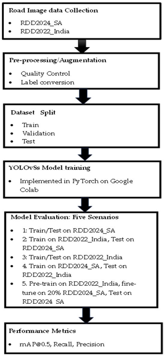 In this study, two objectives have been identified: to implement the YOLOv8s algorithm for automated detection and classification of road damage using smartphone images and to evaluate the model’s performance across five distinct training–testing scenarios involving datasets obtained from Pretoria and Johannesburg in South Africa, and India.