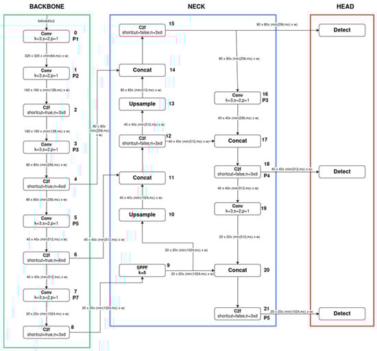 Architecture of the YOLOv8 CNN showing the Backbone, Neck, and Head layers with their attendant components within each layer [38].
