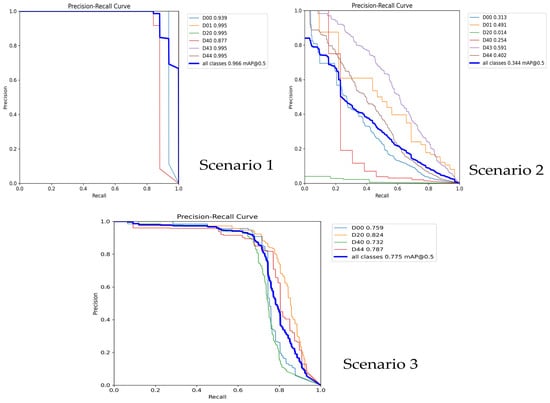 Performance metrics (Precision, Recall, mAP@0.5) for Scenario 3 (reduced 4-class configuration (D00, D20, D40, D44)).