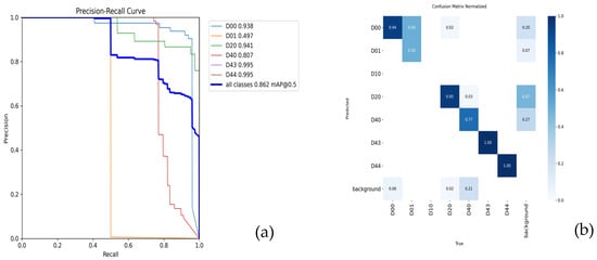 Scenario 5: The transfer-learning experiment applied fine-tuning to the YOLOv8s model originally trained on the RDD2022_India dataset using a 20% subset of RDD2024_SA images. This adaptation led to a substantial recovery in performance, with mAP@0.5 = 0.862, precision = 1.00, and recall = 0.88, compared with the direct cross-domain baseline of Scenario 2 (mAP = 0.32). The precision–recall curves (Figure 11a) demonstrate stable class-level behavior, with consistently high reliability for D20, D40, D43, and D44. The normalized confusion matrix (Figure 11b) further confirms reduced misclassification and improved inter-class separability after fine-tuning. However, D01 remains under-detected, which aligns with its sparse representation in both the Indian and South-African datasets. These results verify that even limited exposure to localized data allows the pretrained model to adjust its learned feature space, thereby closing a large portion of the performance gap created by domain shift.