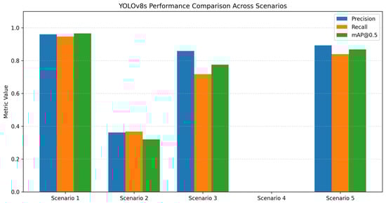 Figure 12 compares the overall performance of YOLOv8s across the five experimental scenarios. Scenario 1 produced the highest accuracy (mAP@0.5 = 0.966), confirming that models perform best when trained and tested on the same domain. Scenario 2 and Scenario 4 show substantial performance degradation, indicating weak cross-regional generalization. Scenario 3 demonstrates that reducing the number of damage classes improves feature separability and detection consistency. Scenario 5 shows that transfer learning, using only 20% of the South African dataset, significantly boosts performance (mAP@0.5 = 0.868), validating the effectiveness of domain adaptation.
