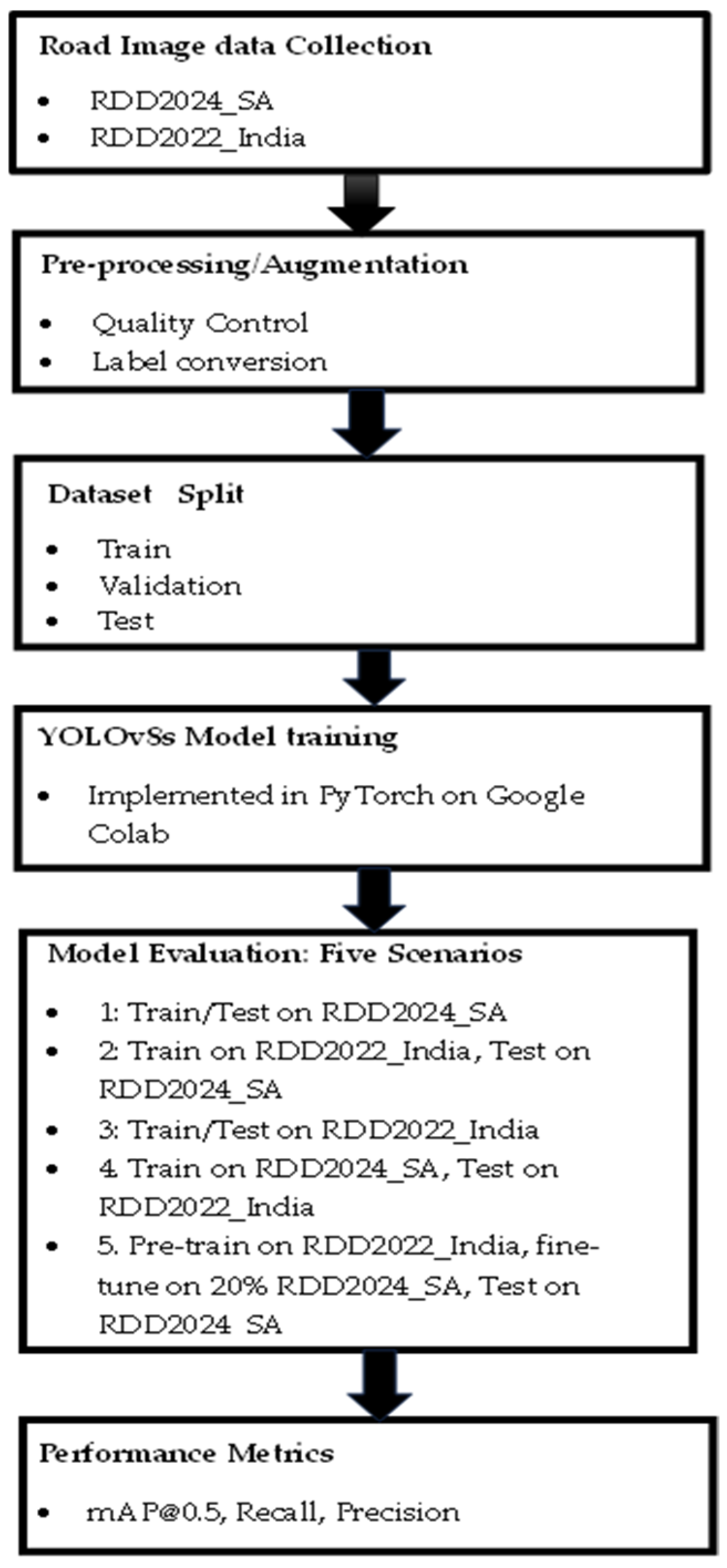 In this study, two objectives have been identified: to implement the YOLOv8s algorithm for automated detection and classification of road damage using smartphone images and to evaluate the model’s performance across five distinct training–testing scenarios involving datasets obtained from Pretoria and Johannesburg in South Africa, and India.