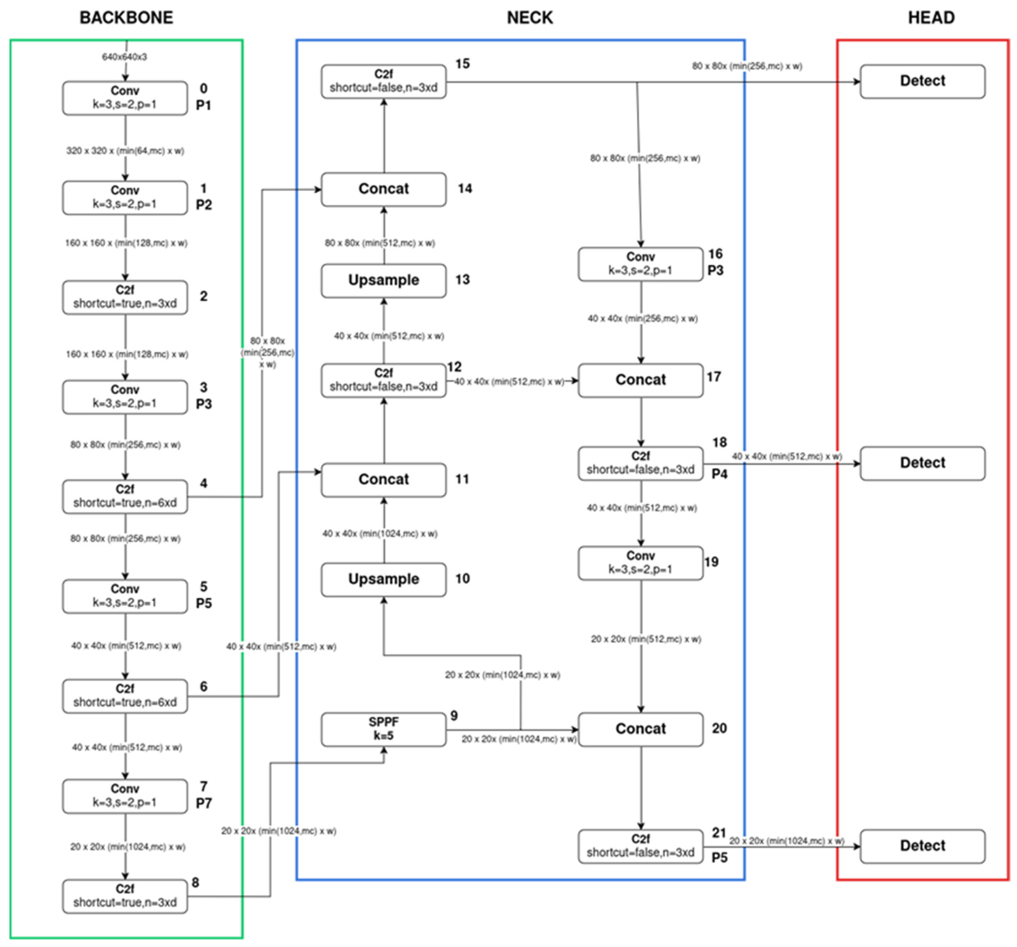 The algorithm structure consists of four main components: the input layer, the Backbone, the neck and detection head. The Backbone layer is the deep learning architecture that acts as a feature extractor for our road dataset images. The features gathered from the different Backbone module layers are combined in the Neck layer. The Head layer, which is the result of the object detection model, forecasts the classes and the bounding box of the objects.