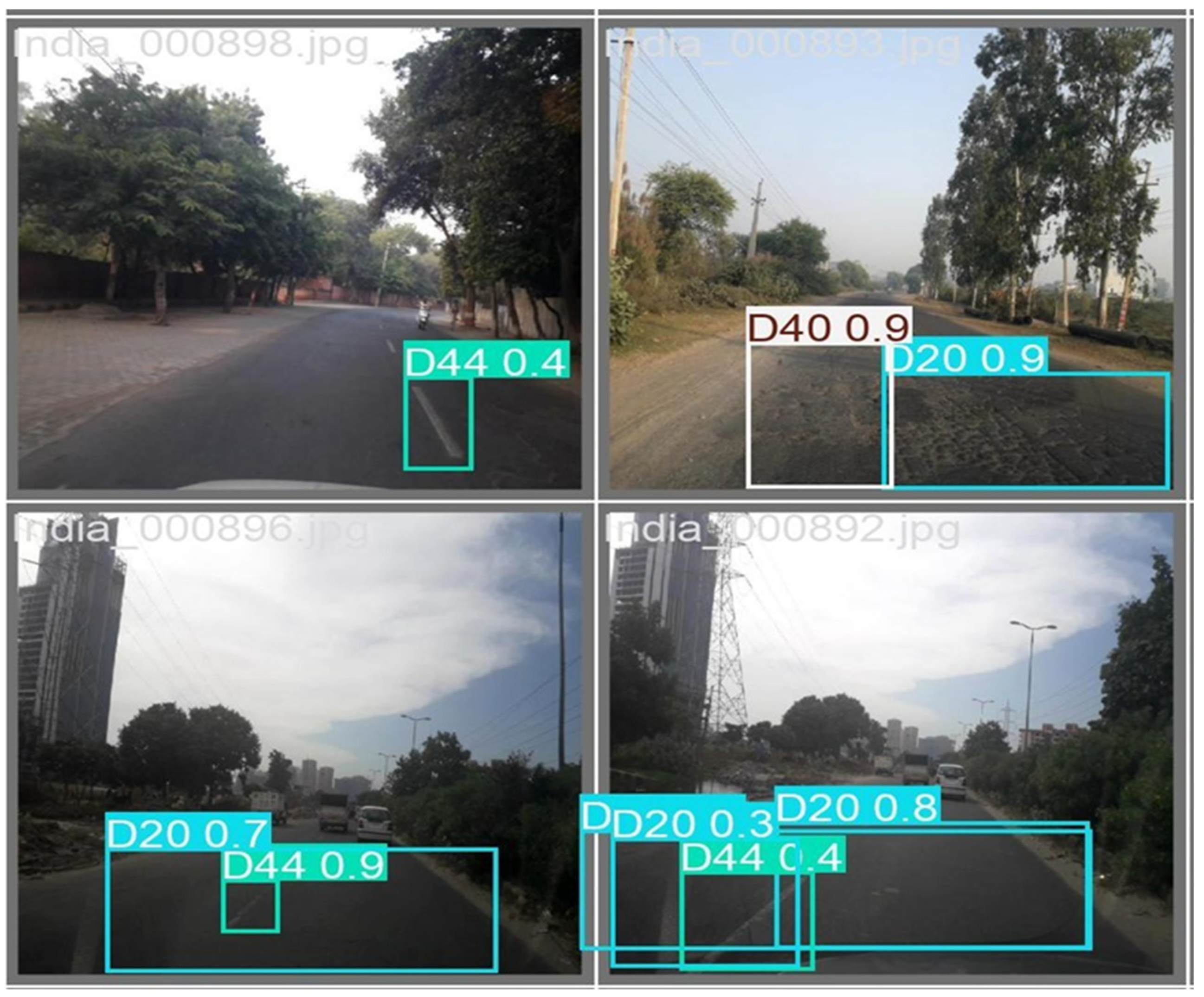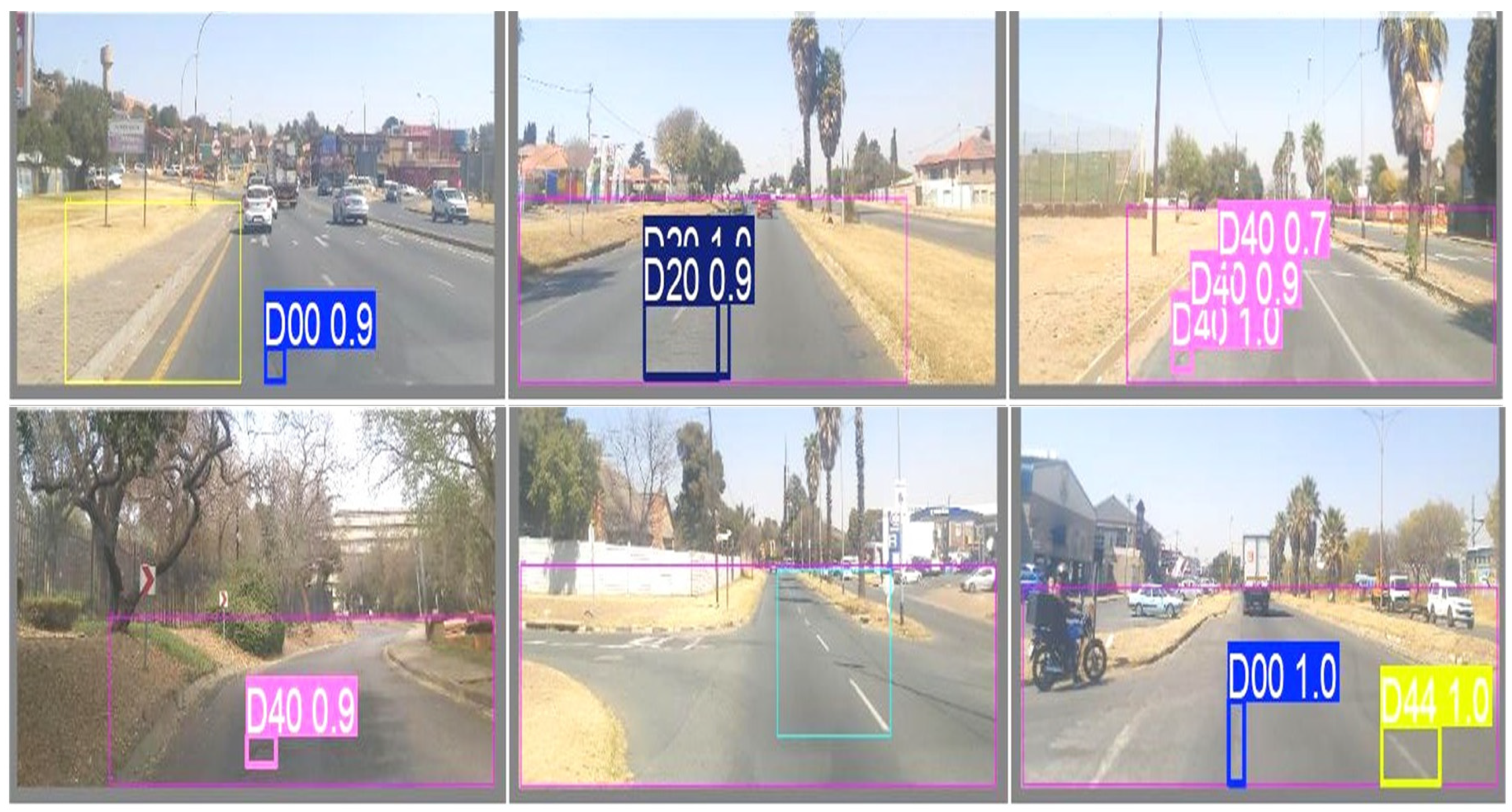 Scenario 2: Using the publicly accessible RDD2022_India dataset for training and the locally measured RDD2024_SA dataset from Pretoria and Johannesburg areas for testing, Scenario 2 assesses the performance of the YOLOv8s model using big data acquired in one region for training and validation, and thereafter applying the trained model for defect identification over small data from another region. Significant differences in detection performance between the damage classes were tabulated in