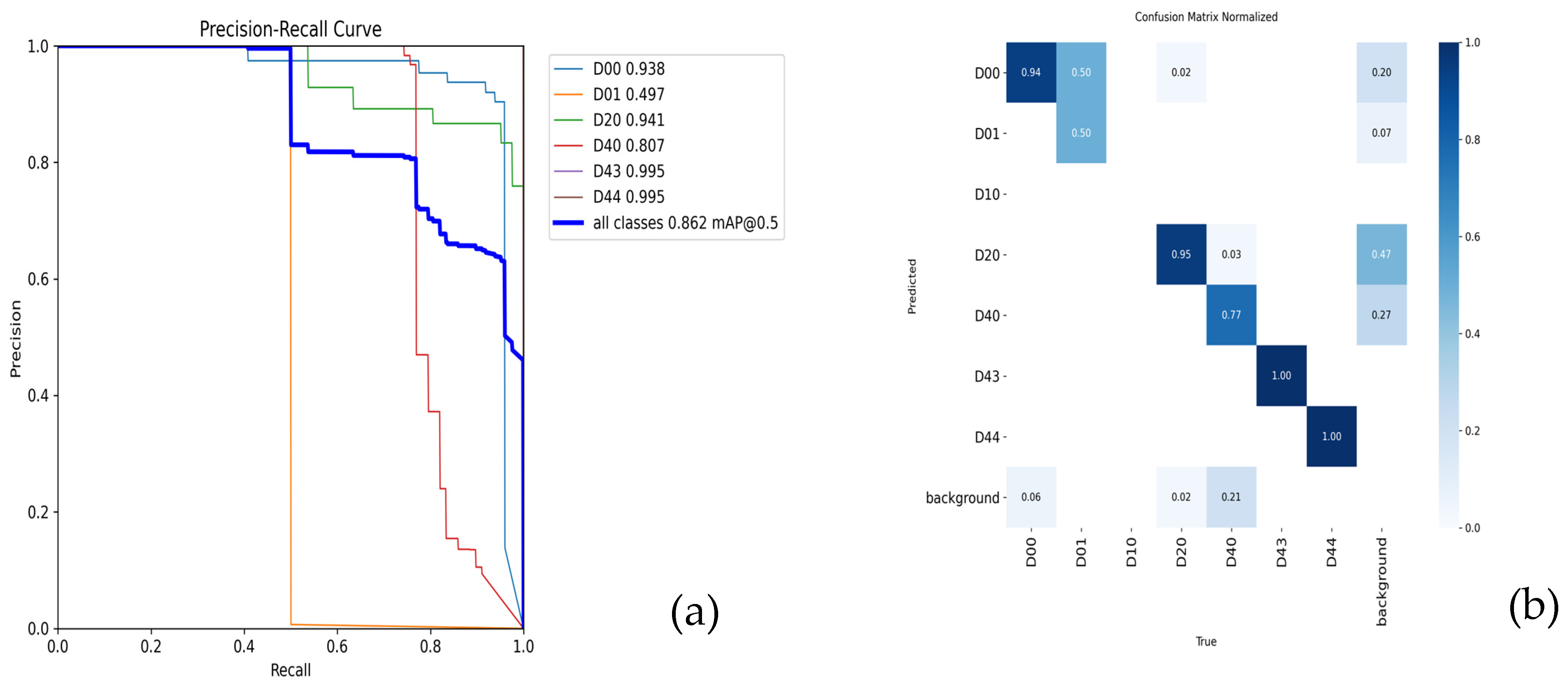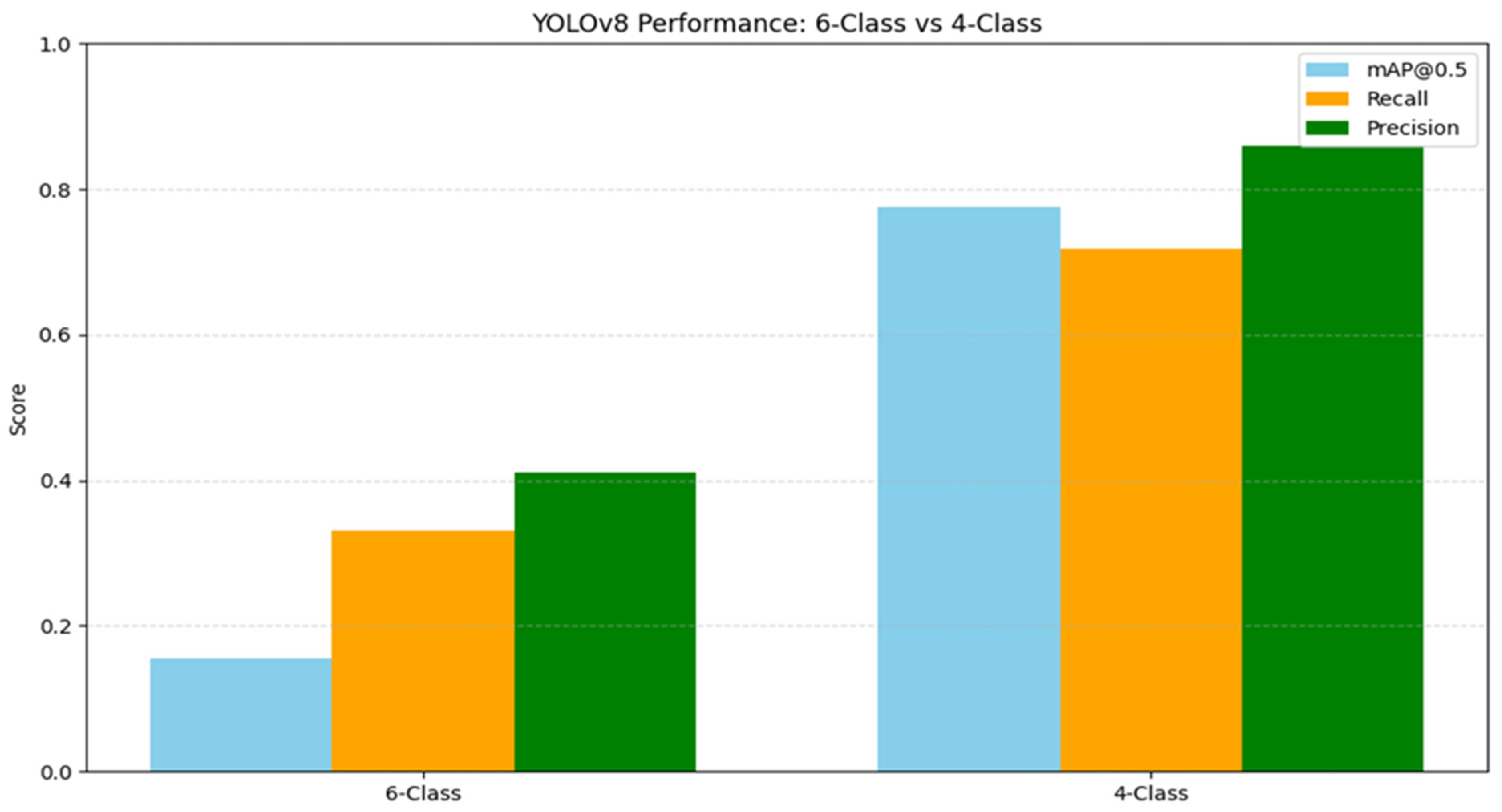 The performance breakdown reveals mAP values of 0.759 for longitudinal cracks, 0.824 for alligator cracks, 0.732 for pothole/separation/rutting, and 0.787 for crosswalk blur. These results indicate more stable and reliable predictions across the retained classes. Removing D01 and D43 helped reduce annotation inconsistencies and intra-class variability that previously introduced noise during training. By simplifying the class taxonomy, the model was able to focus on clearer visual patterns and achieve more stable convergence.