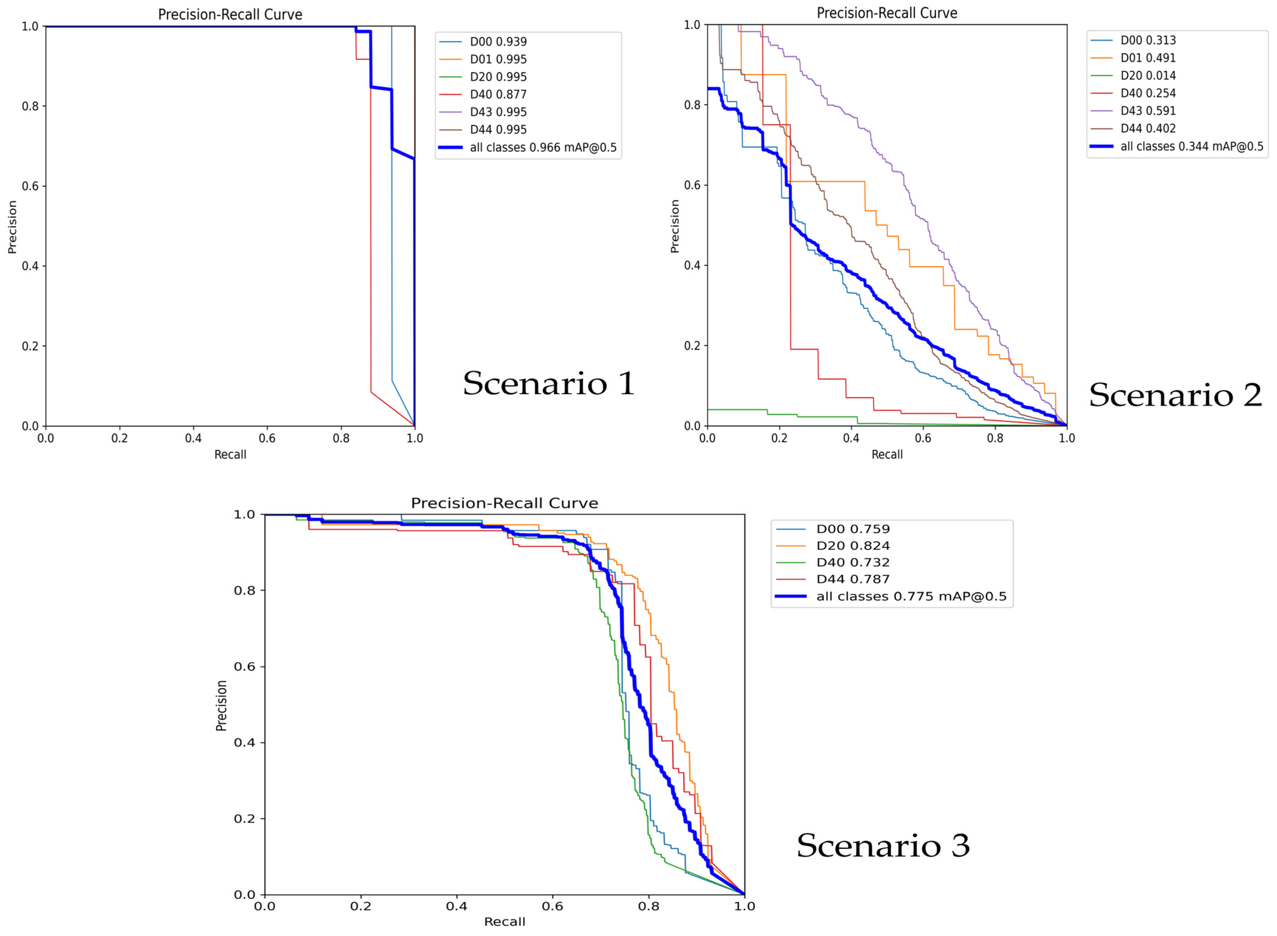 Scenario 1: The object detection model’s performance evaluation across six road damage types, namely, the longitudinal cracks (D00), transverse/linear cracks (D01), alligator cracks (D20), pothole, separation and rutting defects (D40), white line blur (D43), and crosswalk blur (D44), shows consistently high accuracy, with the mean Average Precision (mAP) at an IoU threshold of 0.5 approaching perfect scores for most classes with precision and recall values significantly exceeding 0.90. Interestingly, the model demonstrated a remarkable capacity to accurately recognize all real cases of transverse/linear cracks, alligator cracks, white line blur, and crosswalk blur, achieving perfect recall of 1.0 for five of the six damage types. Pothole, separation and rutting, and longitudinal cracks resulted in the highest precision equal to 1.0 and 0.998, respectively, with the fewest false positives. For four damage types (transverse/linear cracks, alligator cracks, white line blur, and crosswalk blur), the mAP values, with both false positives and false negatives, represent the model’s overall classification performance exceeding 0.99, showing almost faultless localization and classification accuracy.