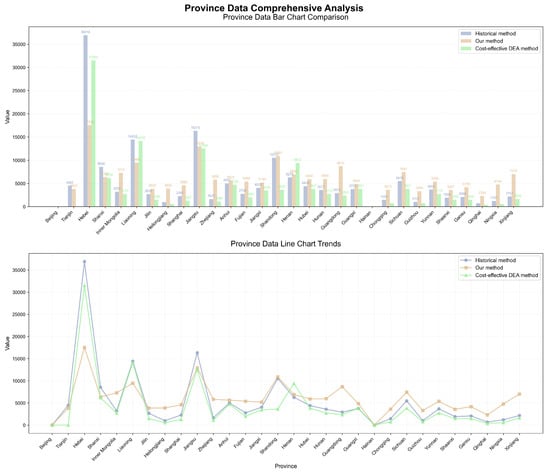 In the formulation, S represents the sum of harmony discrimination indicators; is the weighted composite index coefficient; and represent the upper and lower bound coefficients determined based on provincial characteristics, satisfying and . If all regional pairs pass both the directional discrimination and the degree discrimination, then the initial allocation scheme is considered to have passed the harmony discrimination. Otherwise, the initial allocation scheme is deemed inconsistent and requires adjustment. : represents the value of the i harmony index in the k province. This indicator corresponds to the i indicator value of the l province. The two indicators are used in Formulas (8) to (13) to compare the performance of different provinces in each indicator.