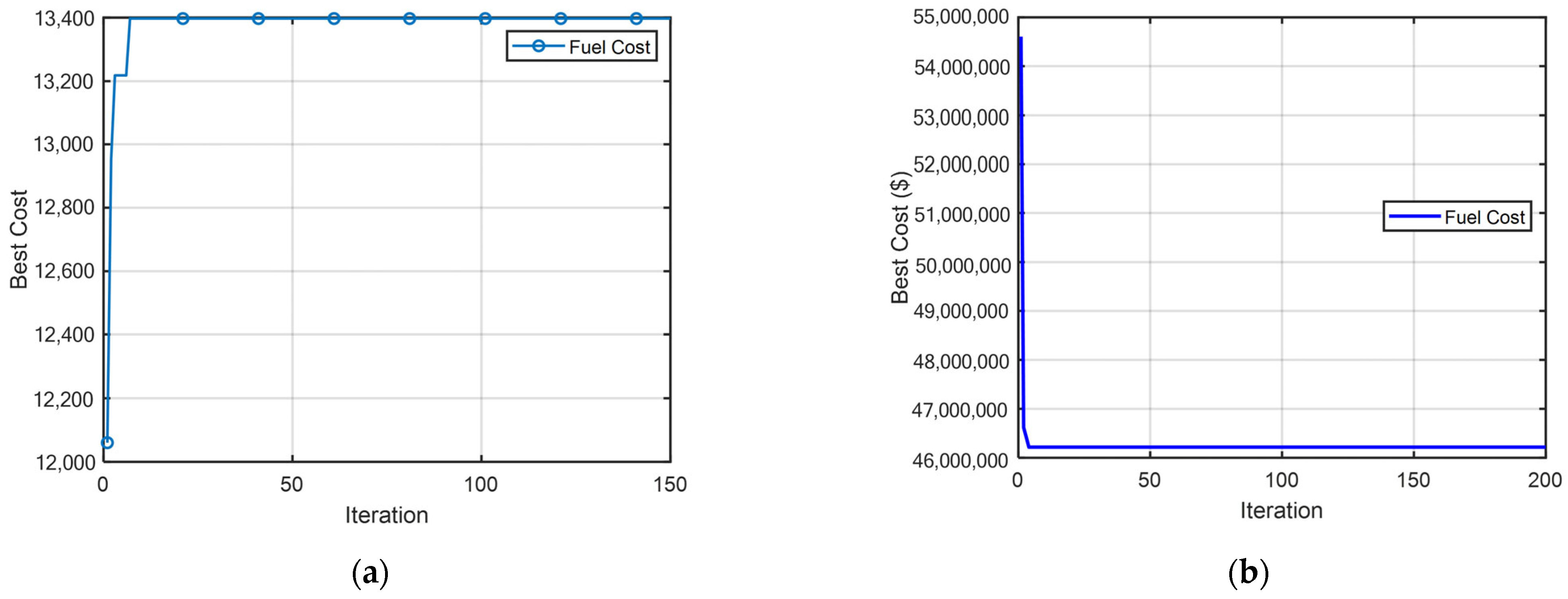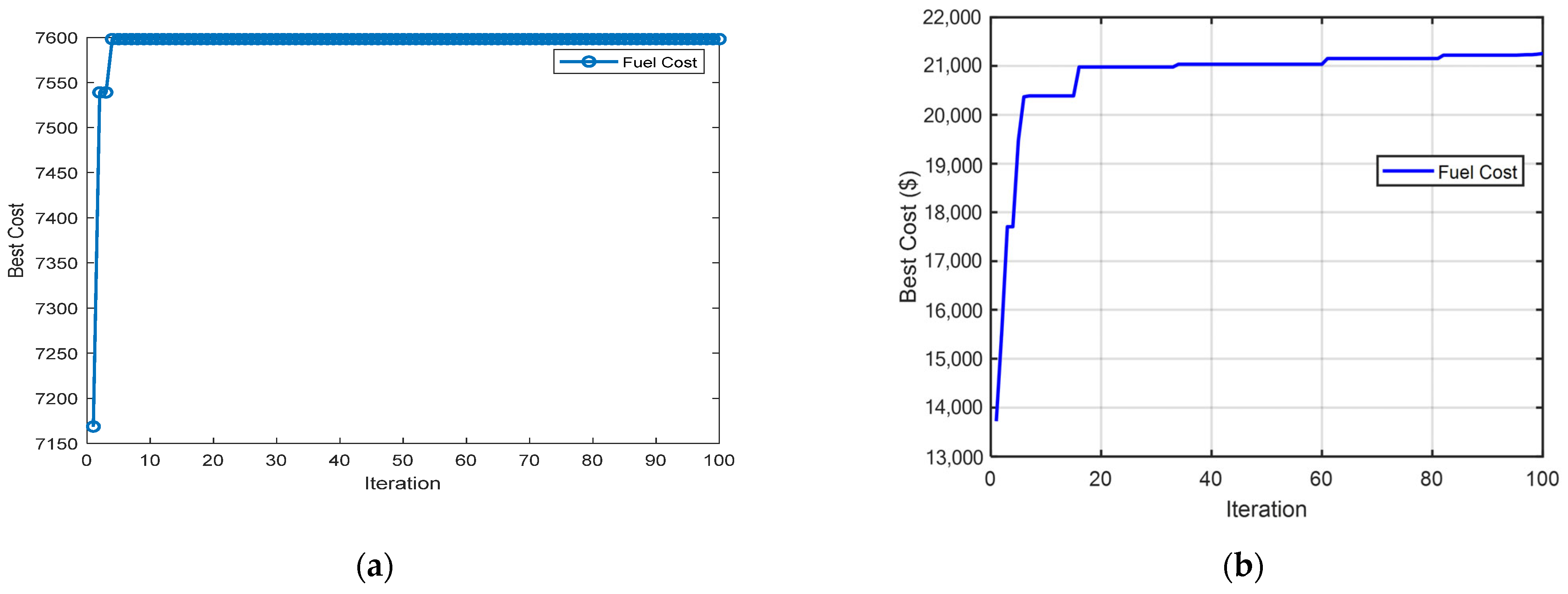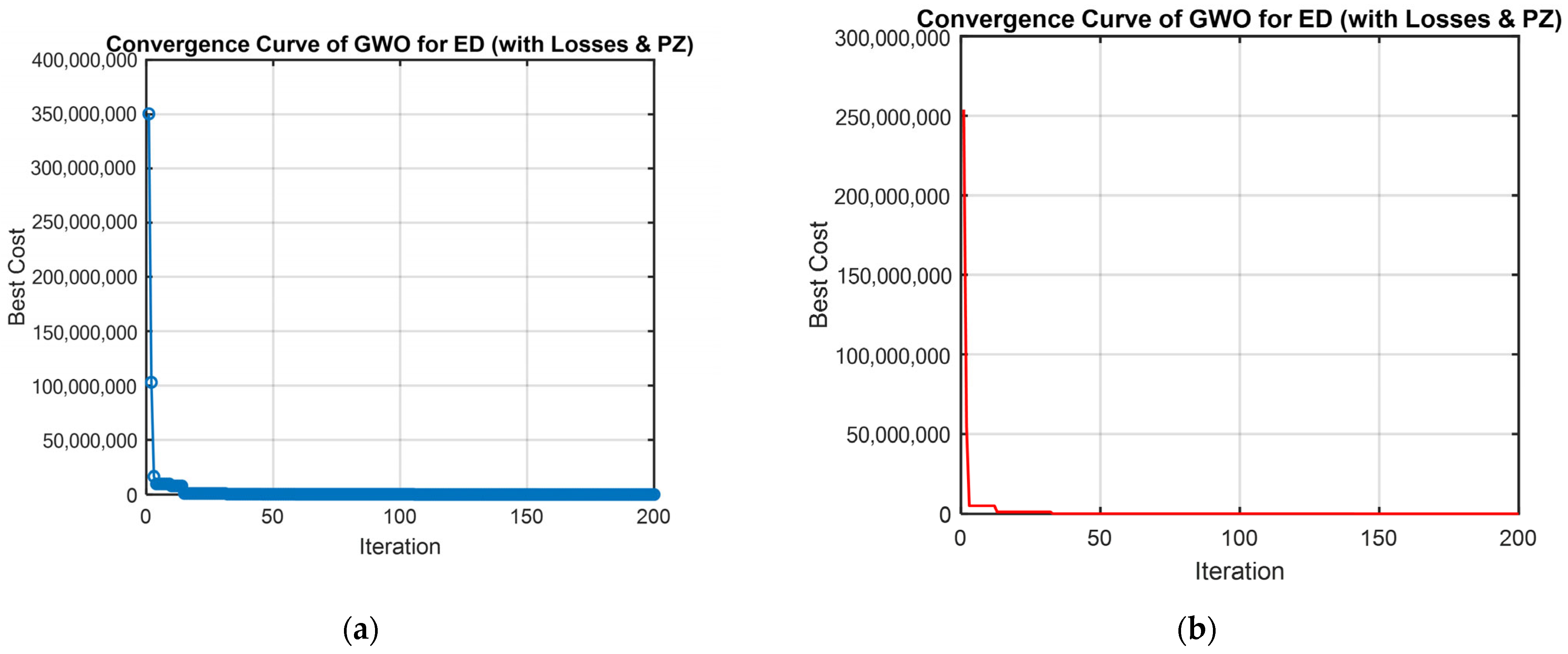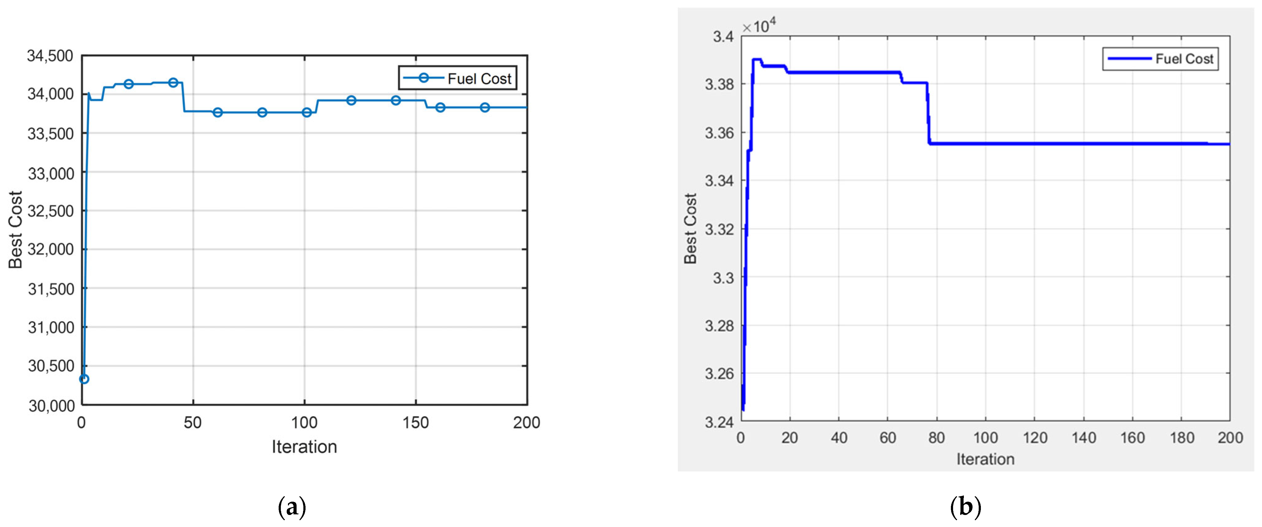 | Algorithm | PSO with Evolutionary Technique [33] | Conventional Algebraic Method [35] | GA Method [29,32] | Memetic Sine Cosine Algorithm (SCA-βHC) [34] | Proposed GWO with Fuel Cost Coefficients | Proposed GWO with Fuel Cost Coefficients Using RES |