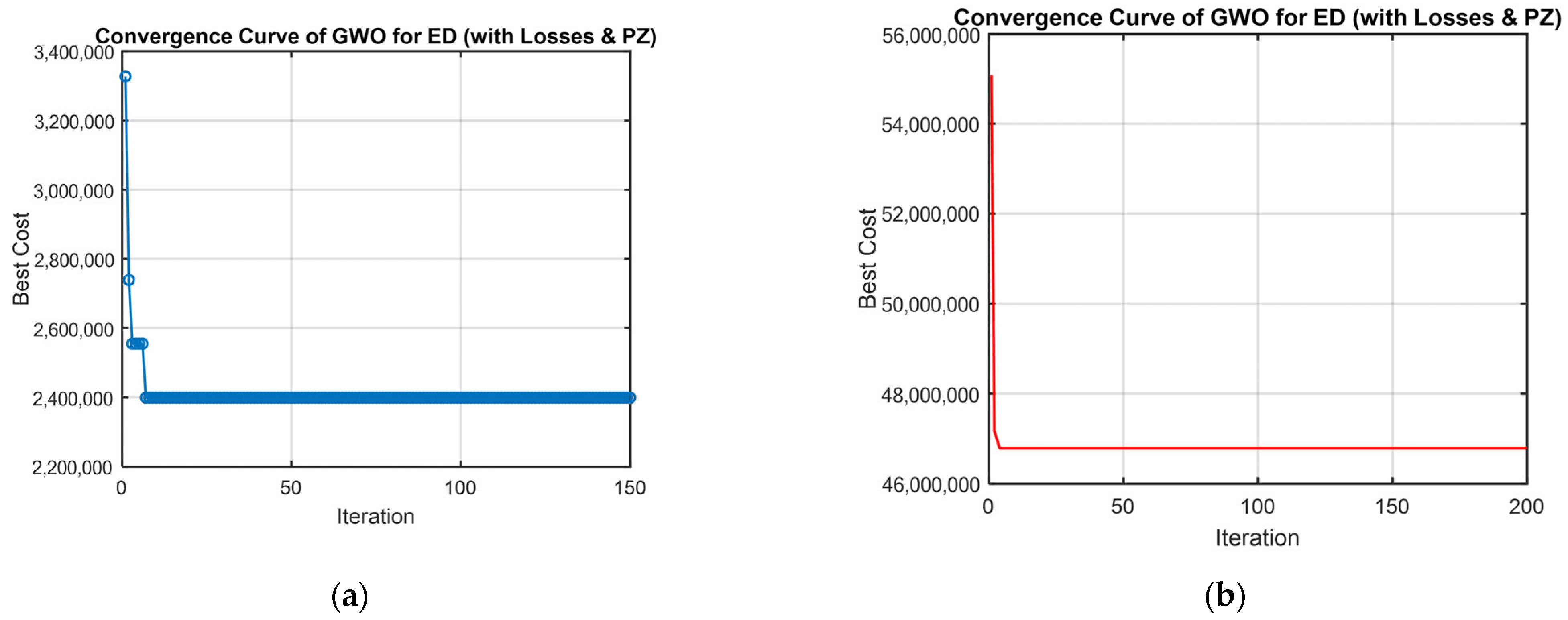 | Algorithm | PSO with Evolutionary Technique [33] | PSO Method [30,31] | GA Method [30,32] | Memetic Sine Cosine Algorithm (SCA-βHC) [34] | Proposed GWO with Fuel Cost Coefficients | Proposed GWO with Fuel Cost Coefficients Using RES |