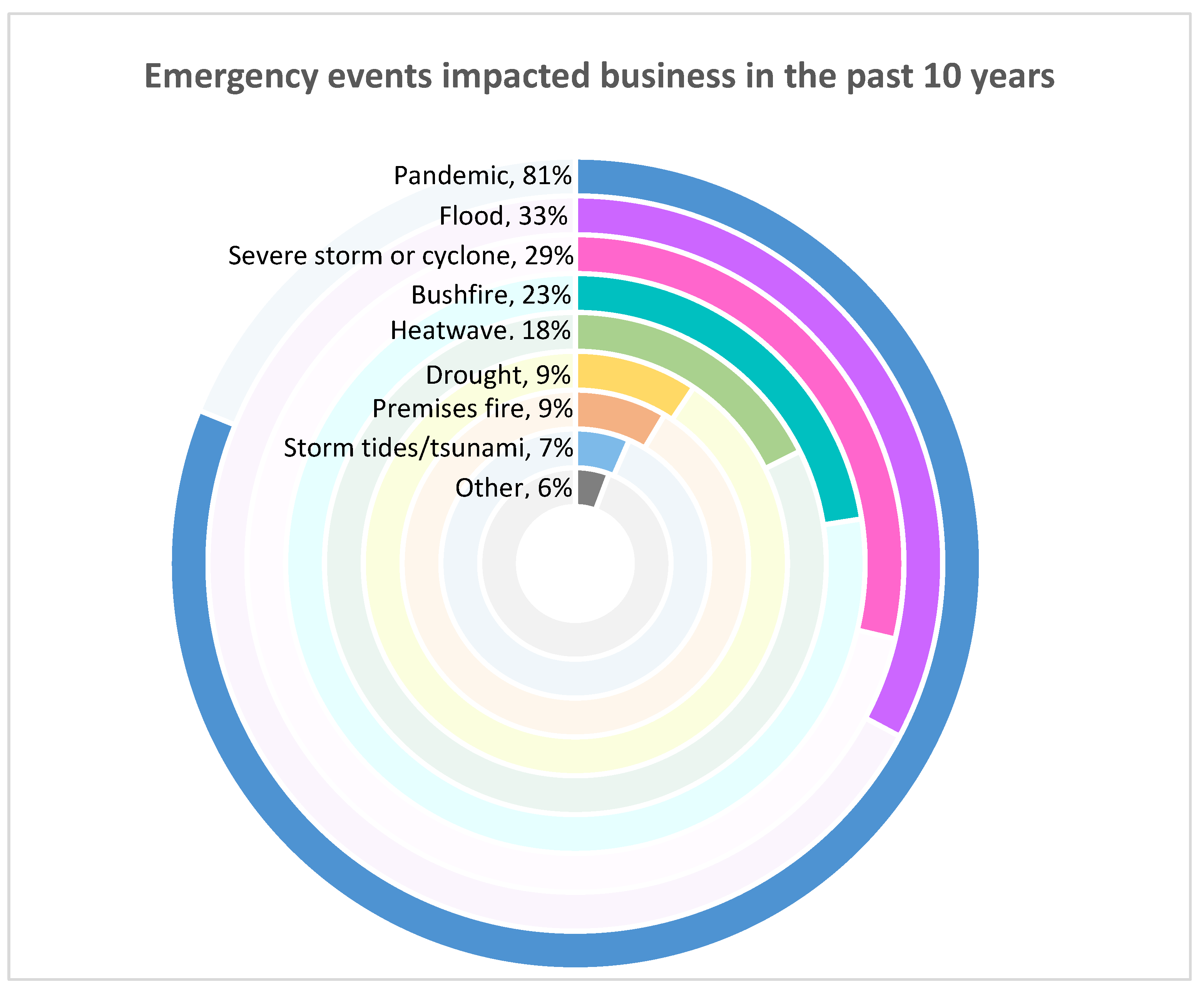 Only 7% of those surveyed reported that their organisations had not been impacted by any hazard events in the past ten years. Others were mostly impacted by pandemic (81%), flood (33%), severe storm or cyclone (29%), and bushfire (23%) (see Figure 1).