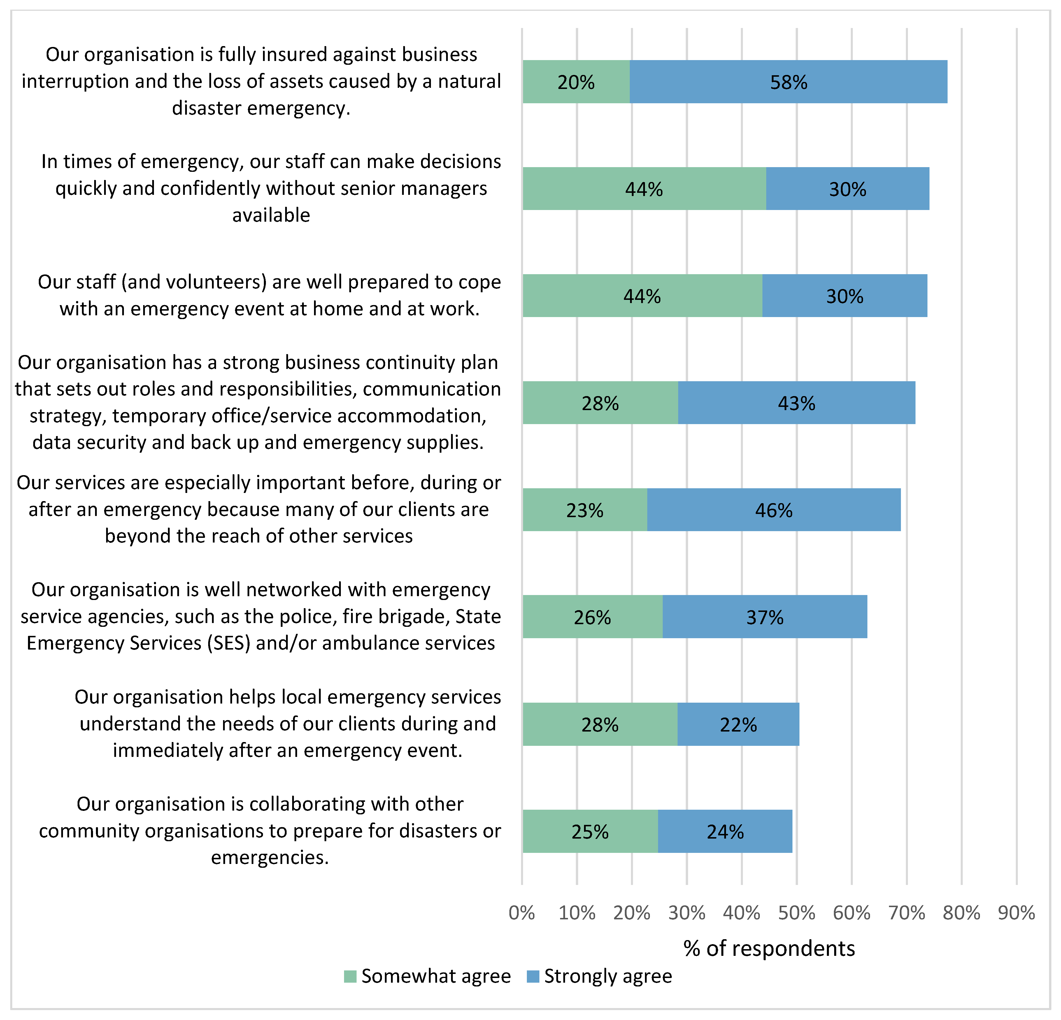 The majority of responding organisations demonstrated a high level of organisational emergency preparedness that could minimise the likelihood of service disruption during a hazard event. The top two box bar chart (see Figure 2) presents the percentages of “strongly agree” and “agree” responses from the five-point Likert scale questions concerning emergency management strategies. The most implemented strategy was “fully insured against business interruption and the loss of assets caused by a natural disaster event (77%)”, while the least implemented strategy was “collaborating with other community organisations to prepare for disasters or emergencies” (49%).