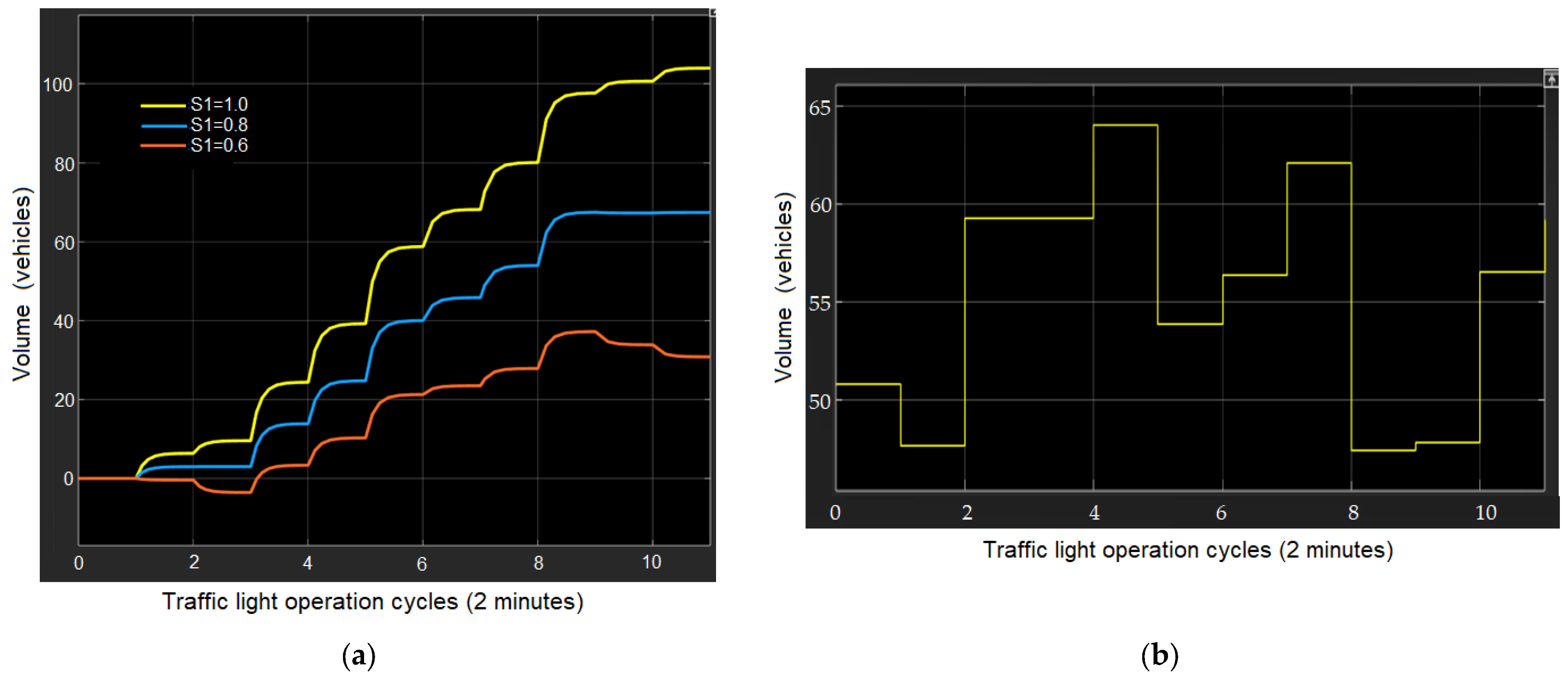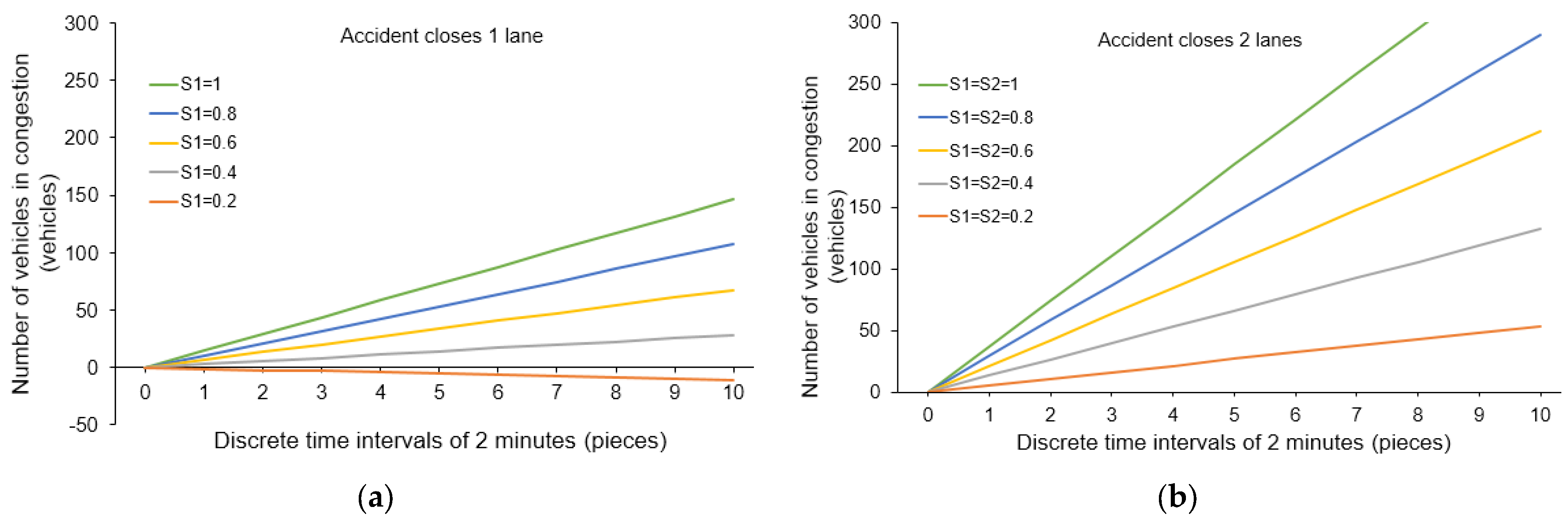 Figure 8b), the congestion tends to dissolve on its own, even without any possible regulatory measures, such as eliminating the cause of the congestion or redirecting traffic flows to other routes. For example, when the capacity is reduced from S1 = 1 to S1 = 0.8, the congestion completely disappears in approximately 2.5 h. This is followed by a “flow growth reserve” defined by negative values for the queue size of vehicles in the congestion.