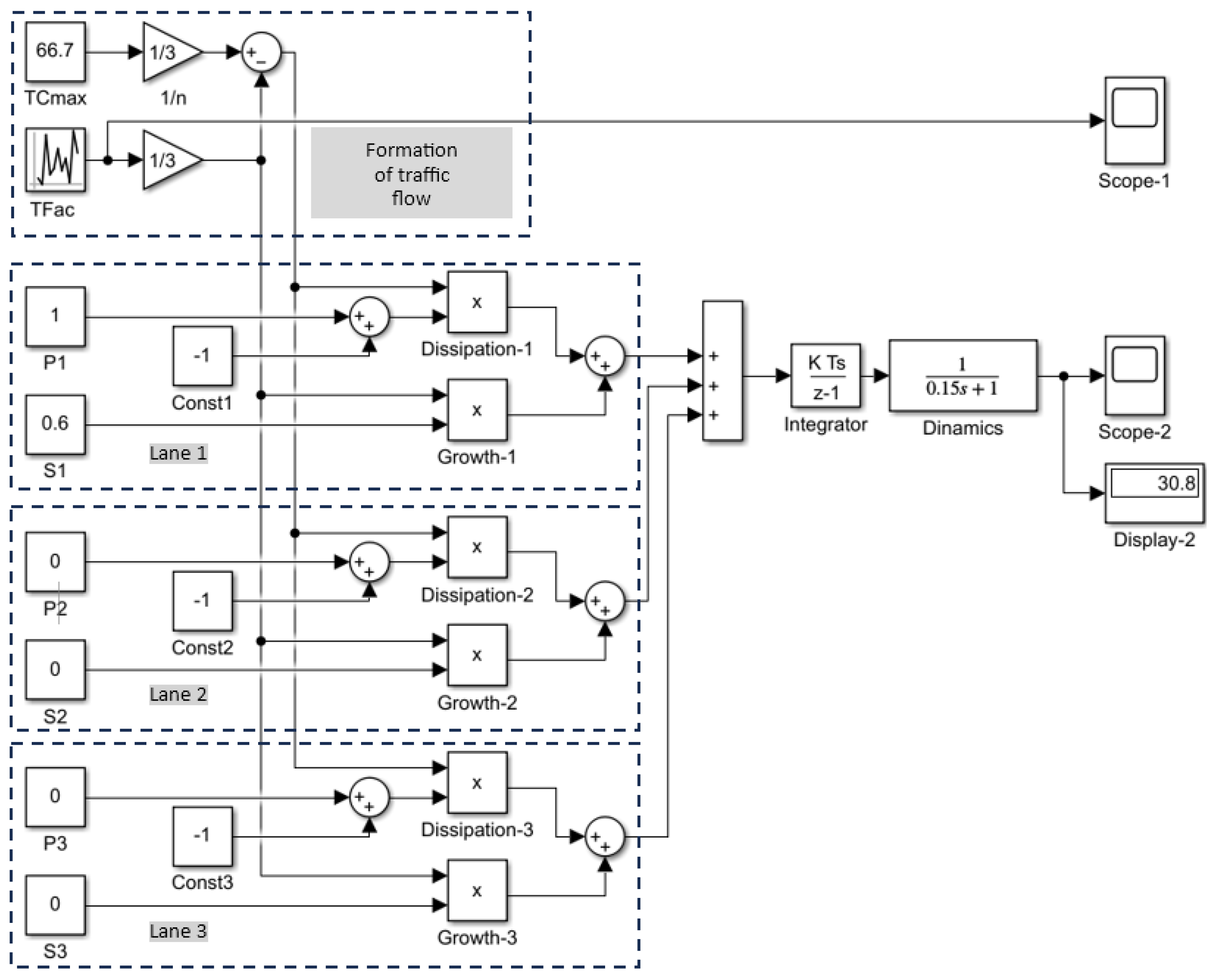 The analytical macroblock should include blocks for calculating deviations in the traffic capacity values for the traffic directions: maximum, average, and actual over an averaged two-minute time interval. Based on these calculations, signal information about the possibility of congestion will be generated. The analytical macroblock will include the following blocks: