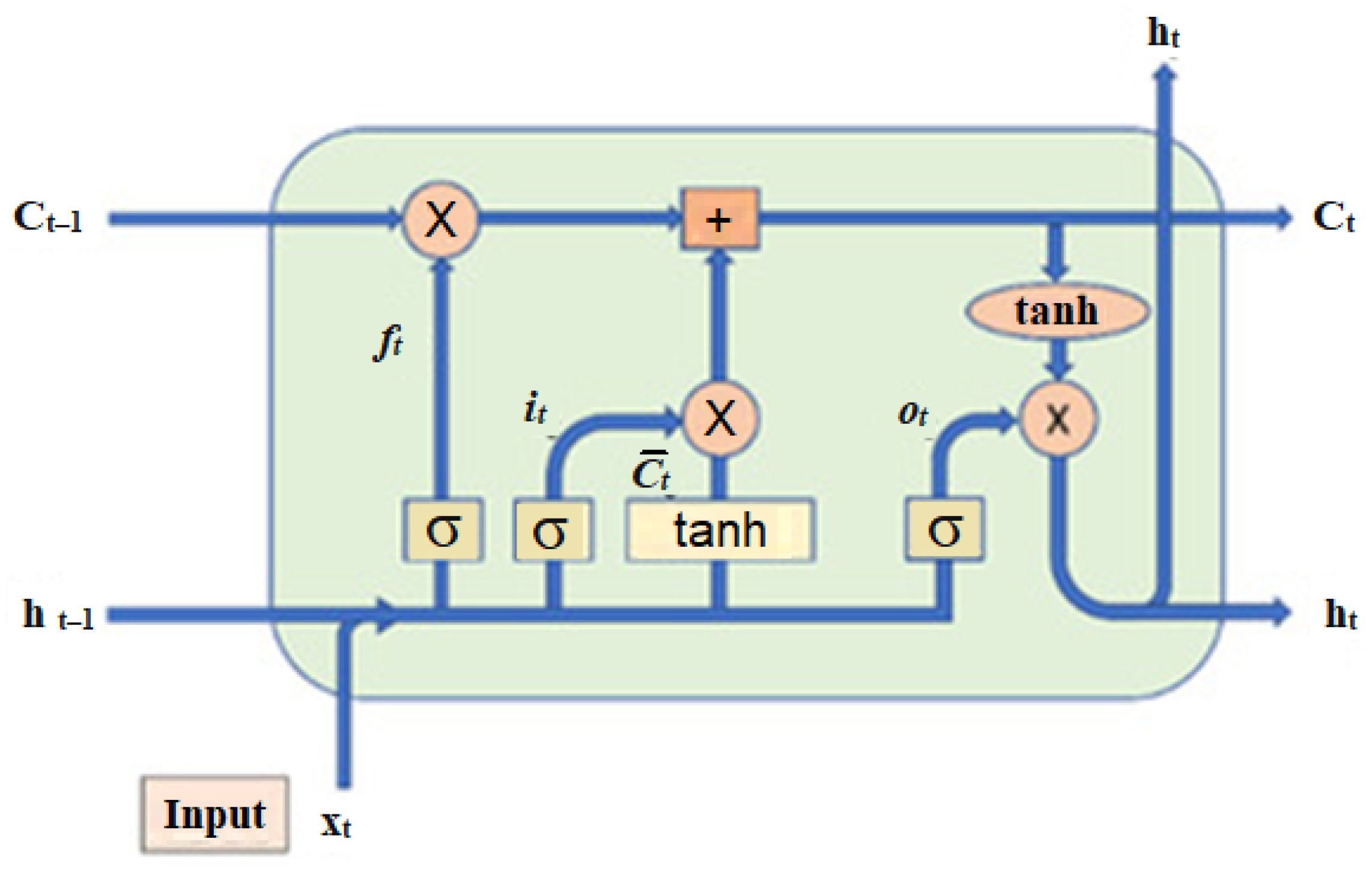 Here, xt represents the observation of a vehicle at time t. Ct is the memory cell, which contains the information at time step t; σ indicates the sigmoid function, ft is the output of the Forget gate at time t.