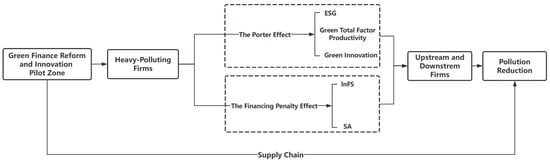 Focusing specifically on the transmission mechanisms of green finance policies, two dimensions can be distinguished, as illustrated in Figure 1: Policy Incentive Mechanism: On one hand, The GFPZ framework fosters a favorable green financing environment that encourages focal firms to invest in green technologies. These innovations may diffuse through supply chain linkages, prompting upstream and downstream firms to adopt cleaner production processes [24]. Simultaneously, green transformation expectations are embedded in contractual relationships, effectively transmitting environmental governance demands and compelling supply chain partners to enhance their environmental performance [16]. Policy Constraint Mechanism: GFPZ policies impose financial constraints on high-emission firms by restricting access to capital. These constraints transmit along the supply chain, prompting upstream and downstream enterprises to adjust capacity and resource allocations in response to the shifting financial landscape. This coordinated response contributes to collective emission reductions.