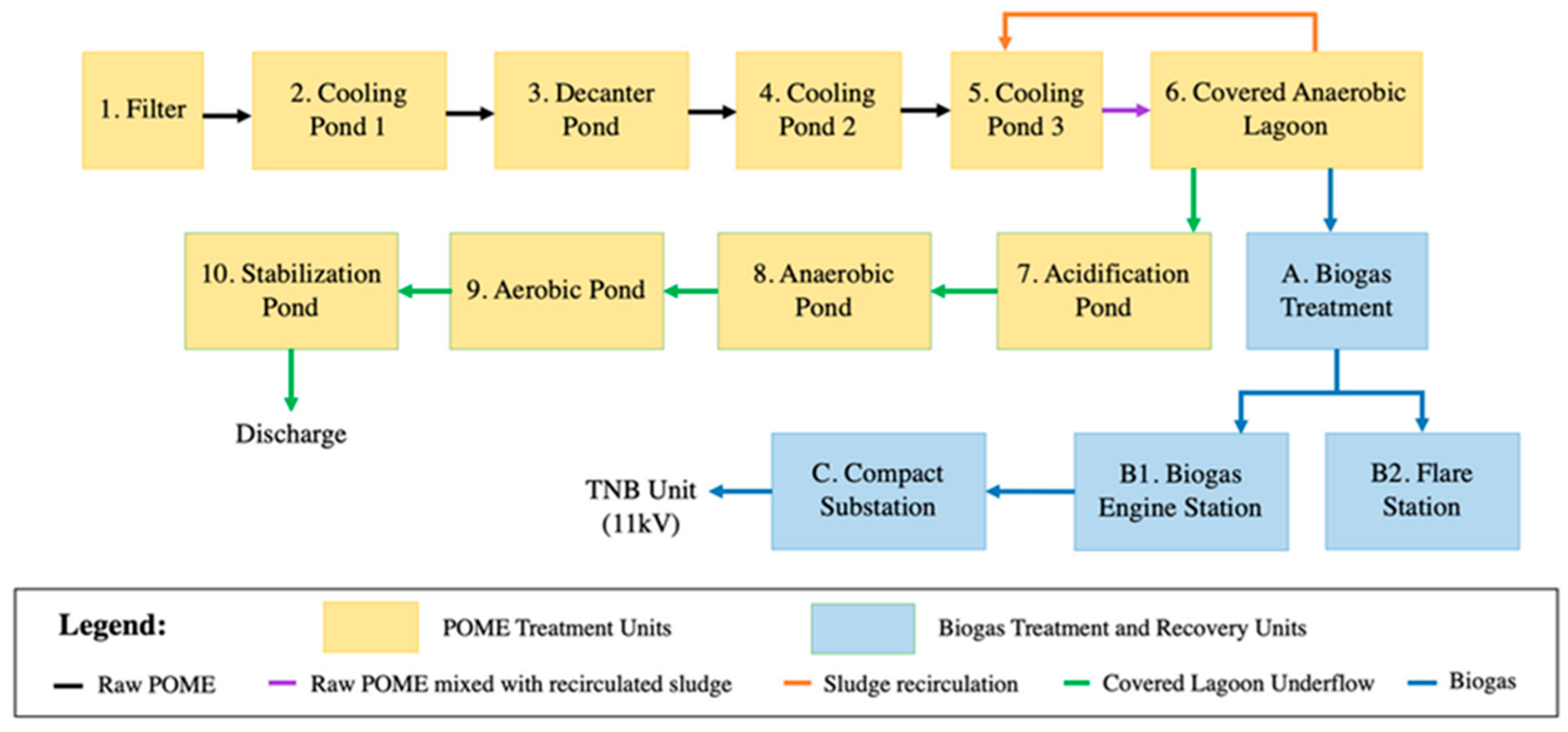 - Mohammad, S.; Baidurah, S.; Kobayashi, T.; Ismail, N.; Leh, C.P. Palm Oil Mill Effluent Treatment Processes—A Review. Processes 2021, 9, 739. [Google Scholar] [CrossRef]