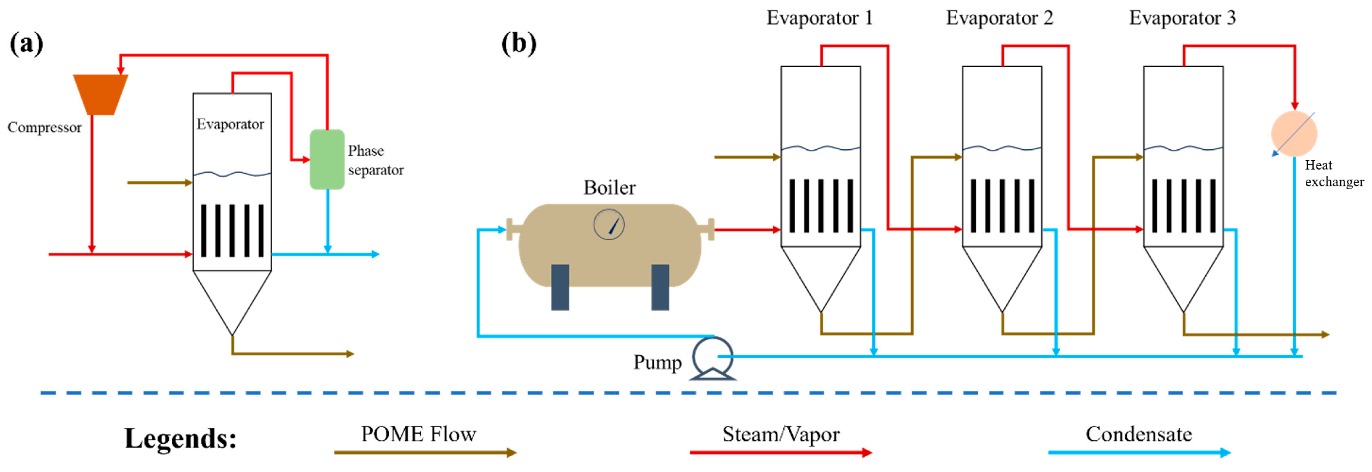 - Tan, Y.D.; Lim, J.S.; Alwi, S.R.W.; Walmsley, T.G. Comparative Assessment for Mechanical Vapour Recompression and Multi-effect Evaporation Technology in Palm Oil Mill Effluent Elimination. CET J.-Chem. Eng. Trans. 2021, 83, 19. [Google Scholar]