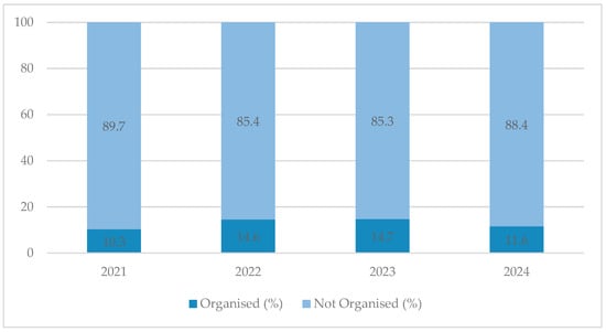 The organisational structure reveals; however, a low proportion of producers who are integrated into associations or cooperatives (organised). Throughout the period analysed, their share did not exceed 15%, reaching its maximum in 2022 and 2023 (14.6% and 14.7%, respectively), and its minimum in 2021 (10.3%) (Figure 2). Although the year-to-year differences are not statistically significant, these data offer a relative benchmark that aligns with previous evidence, which indicates that organisational membership in rural coffee contexts tends to be limited by barriers such as membership costs, geographic dispersion and internal organisational dynamics [3,13,14].