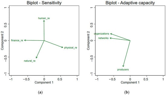 Principal-component biplots of the dimension-level indices for the SYCACC Sensitivity (a) and Adaptive Capacity (b) indices.