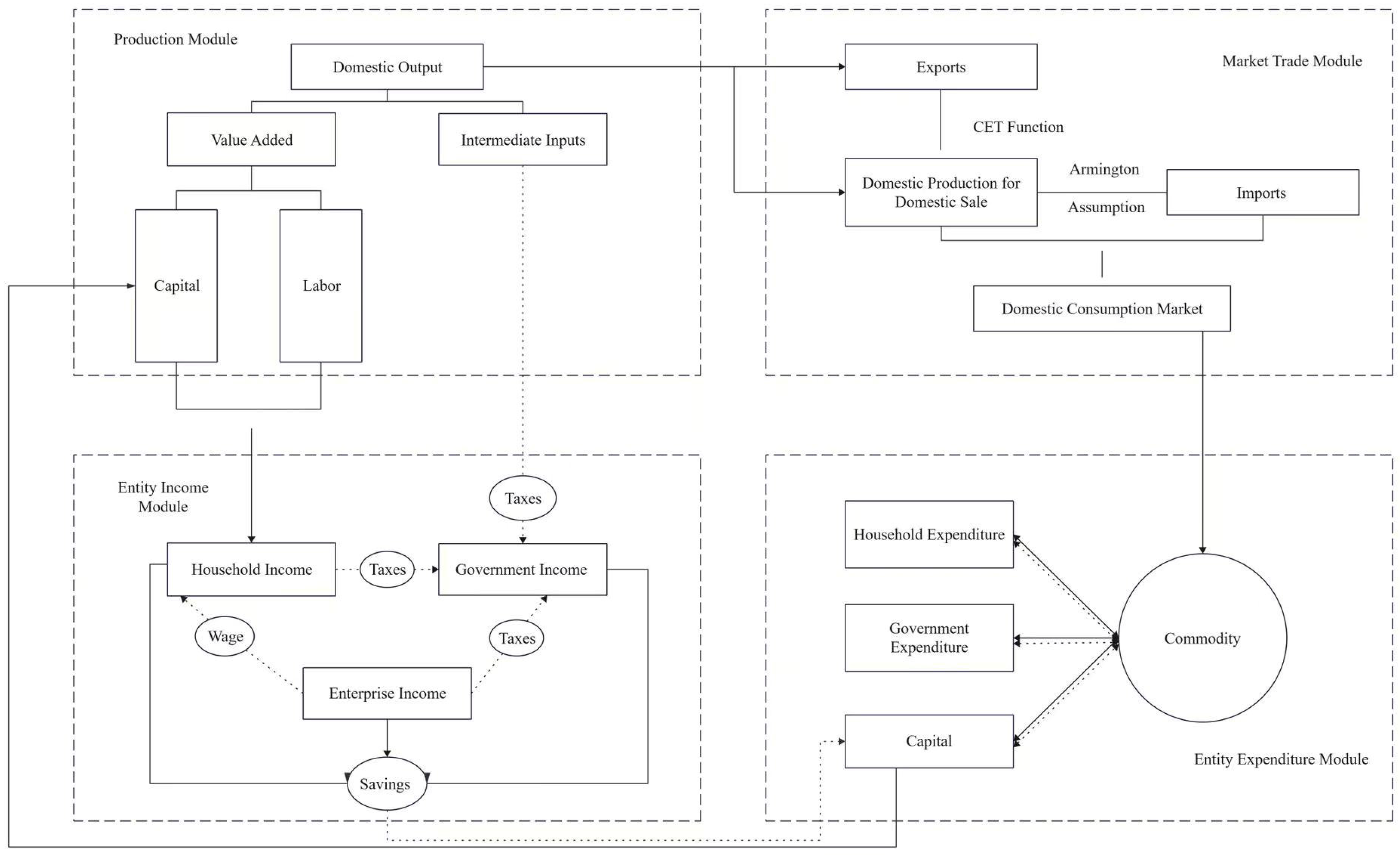 Figure 1 captures the macroeconomic structure of China as portrayed by the Computable General Equilibrium (CGE) model utilized in this study. For further details regarding the fundamental principles and core structure of the CGE model, readers are referred to the research by Jiang [