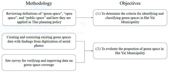 These broader approaches to understanding green spaces and their multiple functions and forms in urban contexts have not been adopted in a widespread manner in Thailand. A review of Thai planning policy, described in more detail in Section 2.2.1, shows that existing policies and frameworks only focus on classifying different types of green spaces without considering that they can have multiple functionalities. Previous studies on green space in Hat Yai Municipality by Ruttirago [16,17] were based on a framework of classifying the spaces based on function. Recreational green space was found to be the smallest category of green space in Hat Yai, and only 59.50% of the population was found to have access to recreational green space within a 1 km radius. This research focuses on applying an existing centralized framework to all green spaces in Hat Yai Municipality, thereby offering both a case study of the framework’s utilization and data on green spaces.