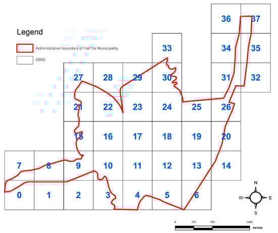 Manual visual analysis of 37 grids and of the digitized aerial photographs identified 802 green spaces, covering a total area of 4.13 square kilometers, which constitutes 19.64% of the study area (Figure 4). The average size of green space is 5145.07 square meters. There is some variation in the size of green spaces. For example, grid 22 has the highest count of different green spaces, but they only total 0.04 km2, while grid 19 has 50 green spaces and the largest total size of green space, comprising over 0.49 km2. This is due to the large, forested area of a rubber forest near the Prince of Songkhla University, Hat Yai Campus. Additionally, one large public park was found to be serving the urban population of Hat Yai, but it is not fully accounted for in the data because the majority of the park’s area is situated within the neighboring Kho Hong Subdistrict Municipality.