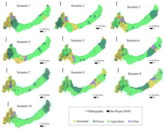 To represent a sufficiently broad range of landscape configurations to evaluate how spatial patterns influence nutrient delivery, 10 synthetic LULC scenarios were generated using the rflsgen R package, based on structural parameters derived from the Suquía River Basin’s actual LULC classes. To simulate the different scenarios, the original LULC classes were regrouped and the nutrient contributions were calculated with these new classes. These scenarios were designed to explore how changes in landscape configuration affect nutrient export while keeping LULC class composition constant, considering four LULC classes (forest, grassland, agriculture and urban). The resulting LULC scenarios (Figure 2), Mean of patch area, Total area, Largest patch index, Percentage of landscape of class, Mean of core area, Landscape division index, Effective Mesh Size, Number of patches, Patch density, Splitting index, Modified Simpson’s diversity index, Patch Richness, Relative patch richness, Shannon’s diversity index, an dShannons’s evenness index, keep constant but vary in configuration metrics such as Mean fractal dimension index, Perimeter-Area Fractal Dimension, Mean perimeter–area ratio, Mean shape index, Mean of core area index, Aggregation index, Patch Cohesion Index, Normalized landscape shape index, Clumpiness index and Modified Simpson’s evenness index. This approach preserved class composition, but introduced variation in patch contiguity, adjacency, and shape complexity.