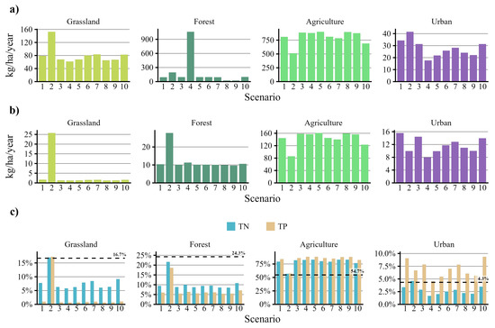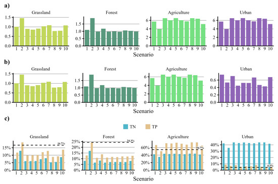 Total export results (kg/ha/year) per scenario and class for (a) total nitrogen and (b) total phosphorus. (c) Total export per scenario and class; the dashed line indicates the class percentage coverage. The specific changes to the indicators for each scenario can be found in Appendix C.
