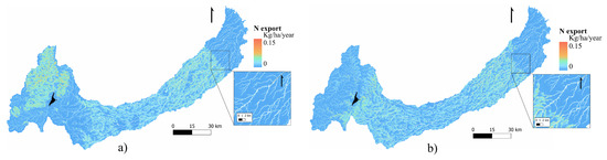Total Nitrogen export per pixel for LULC: (a) scenario 5, (b) scenario 10. Water bodies and major runoffs were not taken into account for the nutrient export calculation.
