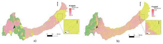 Total Phosphorus export per pixel for LULC: (a) scenario 3, (b) scenario 10. Water bodies and major runoffs were not taken into account for the nutrient export calculation.