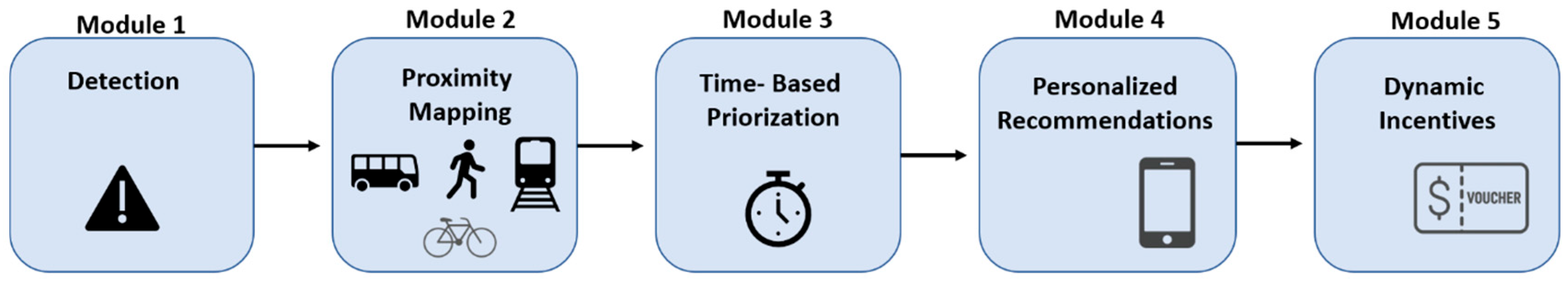 The spatial–temporal dimensions of passenger travel are especially relevant for managing transport disruptions. Based on this premise, it is proposed that MaaS platform integrates a spatial–temporal PT framework, comprising five key modules: detection, proximity mapping, time-based prioritization, personalized recommendations, and dynamic incentives, as illustrated in Figure 3.