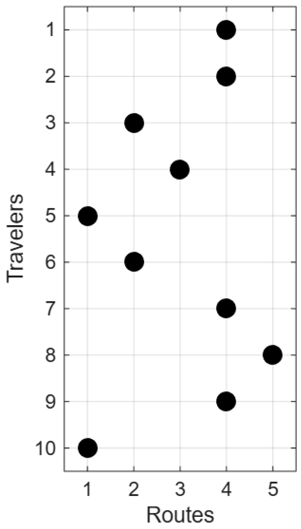 TravelerRouteTravel Time (min)Wait Time (min)Walk Distance (m)Transfers