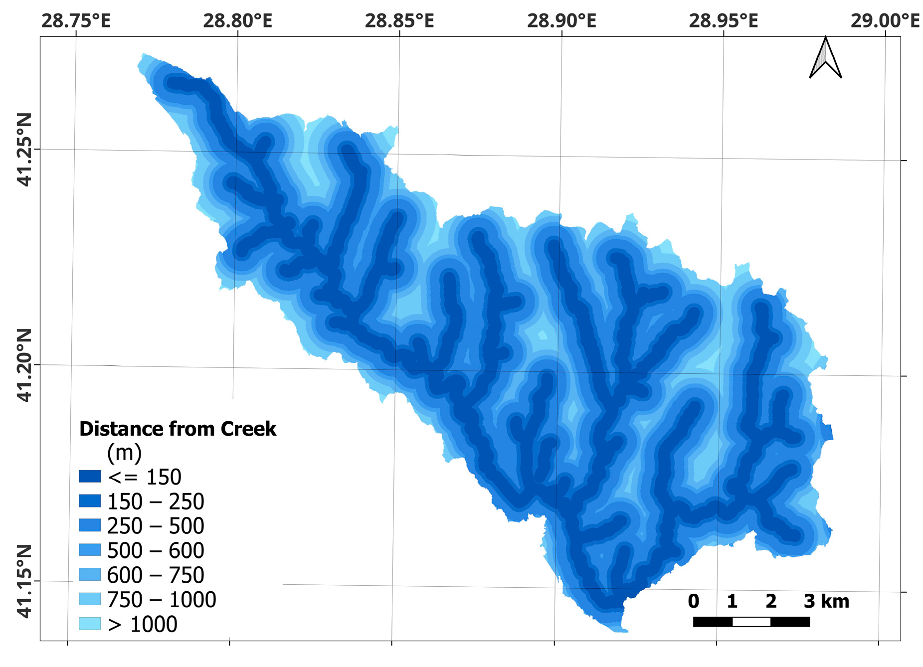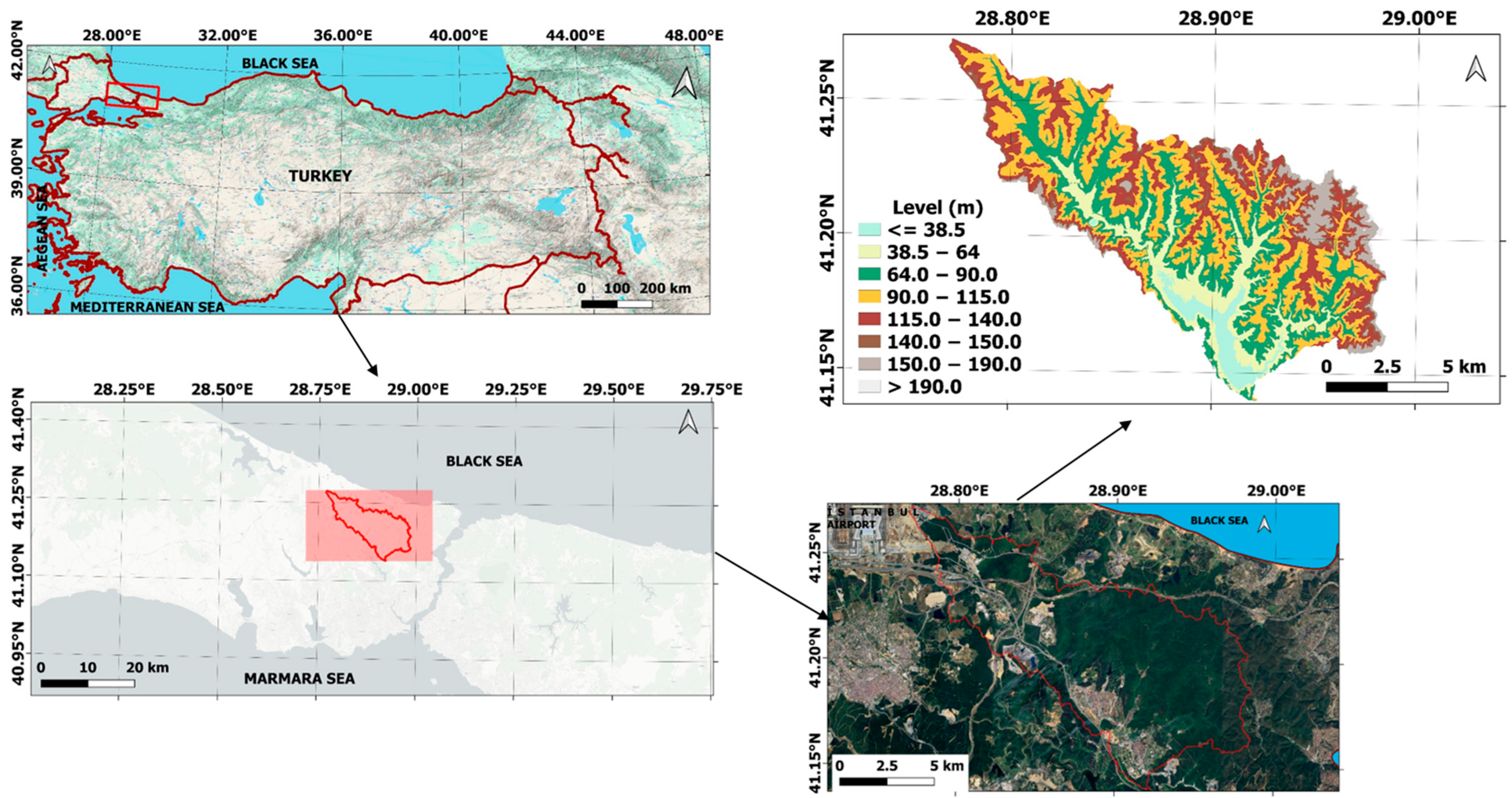 This study was conducted within the Kağıthane Basin, located in Istanbul, covering an area of approximately 113 km2 (Figure 1). An examination of the basin reveals that the southern part is densely populated, while rural settlements and forested areas become more prominent towards the north. Istanbul Airport is situated in the northwestern section of the region. Additionally, several water bodies, such as Göktürk, Kemer Country, Ayvat, and Topuzlu, are located within the basin. The Kağıthane Stream flows through the basin and eventually discharges into the Golden Horn.