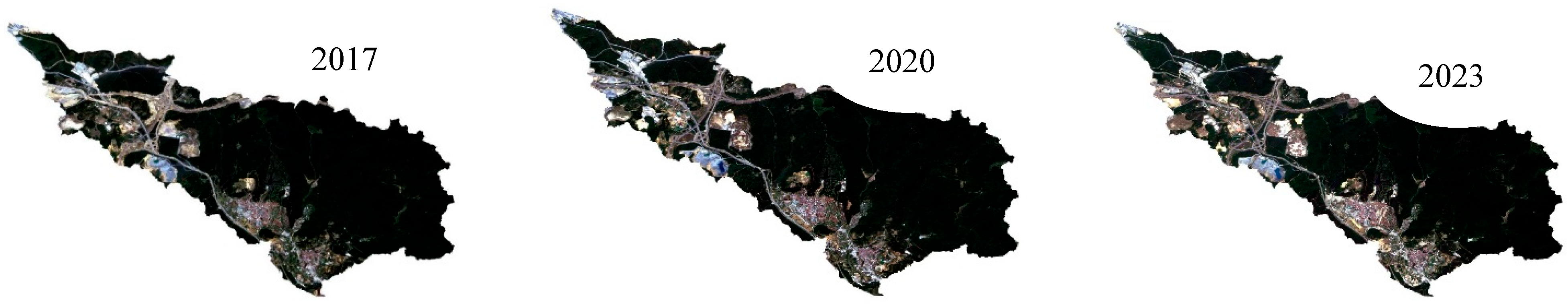 To determine land cover and land use, MultiSpectral Instrument (MSI) Level-2A satellite images from 2017, 2020, and 2023 were used (Figure 2). The Sentinel-2 satellite, as part of the Copernicus Land Monitoring program, provides detailed multi-spectral imagery that supports the observation of vegetation, land characteristics, and surface water, as well as tracking changes in inland water bodies and coastal landscapes [49]. For each year, images with less than 3% cloud cover taken between April and November were selected. The number of selected images was 13 in 2017, 16 in 2020, and 20 in 2023. These multiple images were combined into a single composite image for each year. Additionally, co-polarized (VV) and cross-polarized (VH) time-series data obtained from the Sentinel-1 satellite for the same periods were also used in the analysis. The number of Sentinel-1 images was 119 in 2017, 122 in 2020, and 70 in 2023. These images were combined to create a single composite for each year. The ALOS World 3D-30m (AW3D30) dataset was also used to obtain topographic and slope data for land use analysis. This dataset provides a global digital surface model (DSM), with a horizontal resolution of approximately 30 m (equivalent to a 1 arc-second grid) [50].