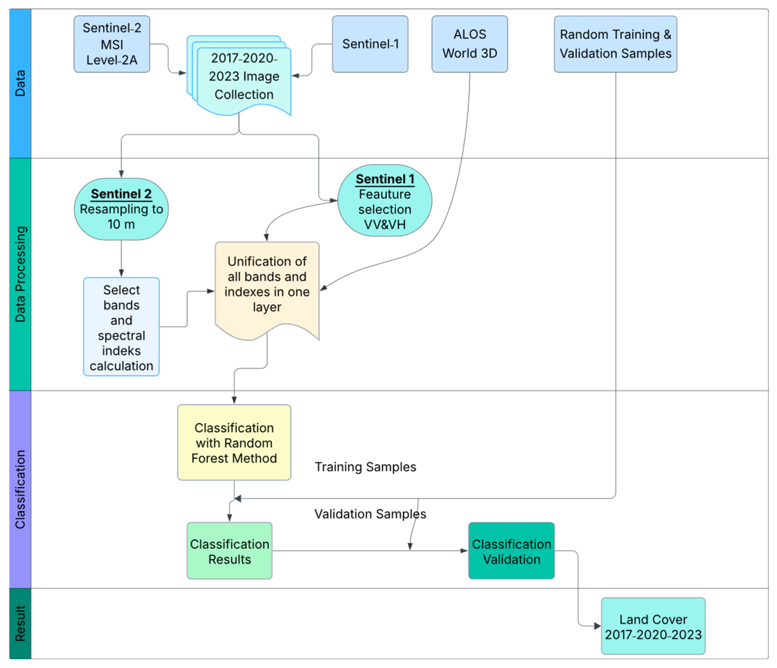 The methodology used to determine land cover for 2017, 2020, and 2023 is shown schematically in Figure 3. As illustrated in the figure, the raw data were first preprocessed, then classified. All these steps were carried out using Google Earth Engine (GEE), a cloud-based platform.