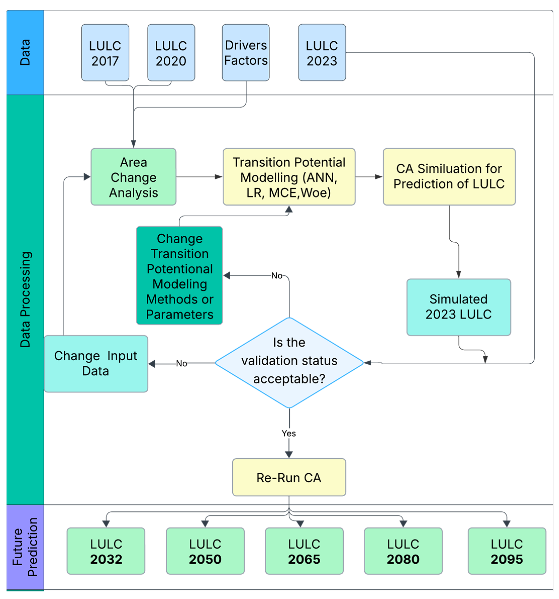 In recent years, numerous studies have demonstrated the effectiveness of artificial intelligence and machine learning-based approaches in modeling land use across different geographical regions and making future projections. For instance, in [12], land use changes in the Pakhal Lake basin in India were analyzed using Sentinel-2 satellite imagery and deep learning techniques, and future projections were generated with the cellular automata (CA)–Artificial Neural Network (ANN) model. In their study, auxiliary data such as a Digital Elevation Model (DEM), aspect, slope, and distance to roads were also used to create LULC change maps, and transitions between land use categories were analyzed through transition matrices. Similarly, in [13], predicted land cover changes in the Yellow River basin of China up to 2030 were modeled using logistic regression and cellular automata, forecasting a decline in agricultural areas and an increase in forested lands. In [14], land use changes and future projections were evaluated for different periods using random forest and CA–ANN models. In Bangladesh’s Chittagong region, land use and land cover have reportedly changed significantly due to human activity, population growth, and climate change [31]. Landsat data from 1990 to 2020 were analyzed to examine these changes, and the CA–ANN model was used to create projections for 2020–2035. The findings, which can serve as a helpful guide for sustainable land management, show a rise in populated areas and a decrease in agricultural and natural lands [31].