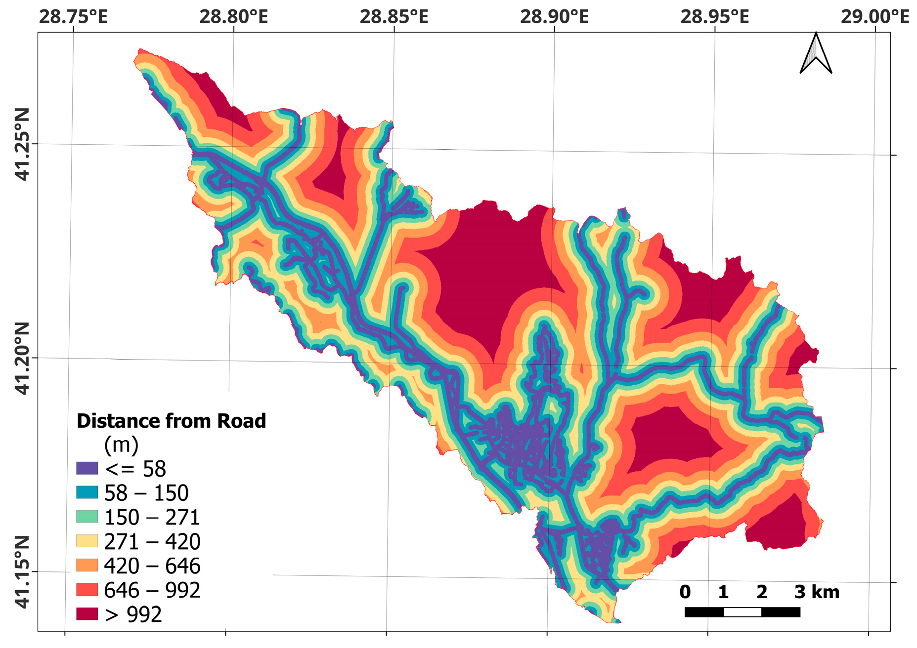 The modeling process began with a temporal comparison of land cover classification maps from earlier periods, enabling the creation of change matrices. Then, the factors driving land use changes were identified, and the corresponding spatial layers were generated. These factors include elevation, slope, and aspect maps derived from the Digital Elevation Model (DEM), along with Euclidean distances to roads, distance to hydrological networks (streams), and anthropogenic effects such as population density. All these factors were modeled in spatial data format using appropriate GIS software such as QGIS (3.28.3-Firenze) and ArcGIS (10.5). The resulting maps are shown in Figure 5, Figure 6, Figure 7, Figure 8, Figure 9 and Figure 10.