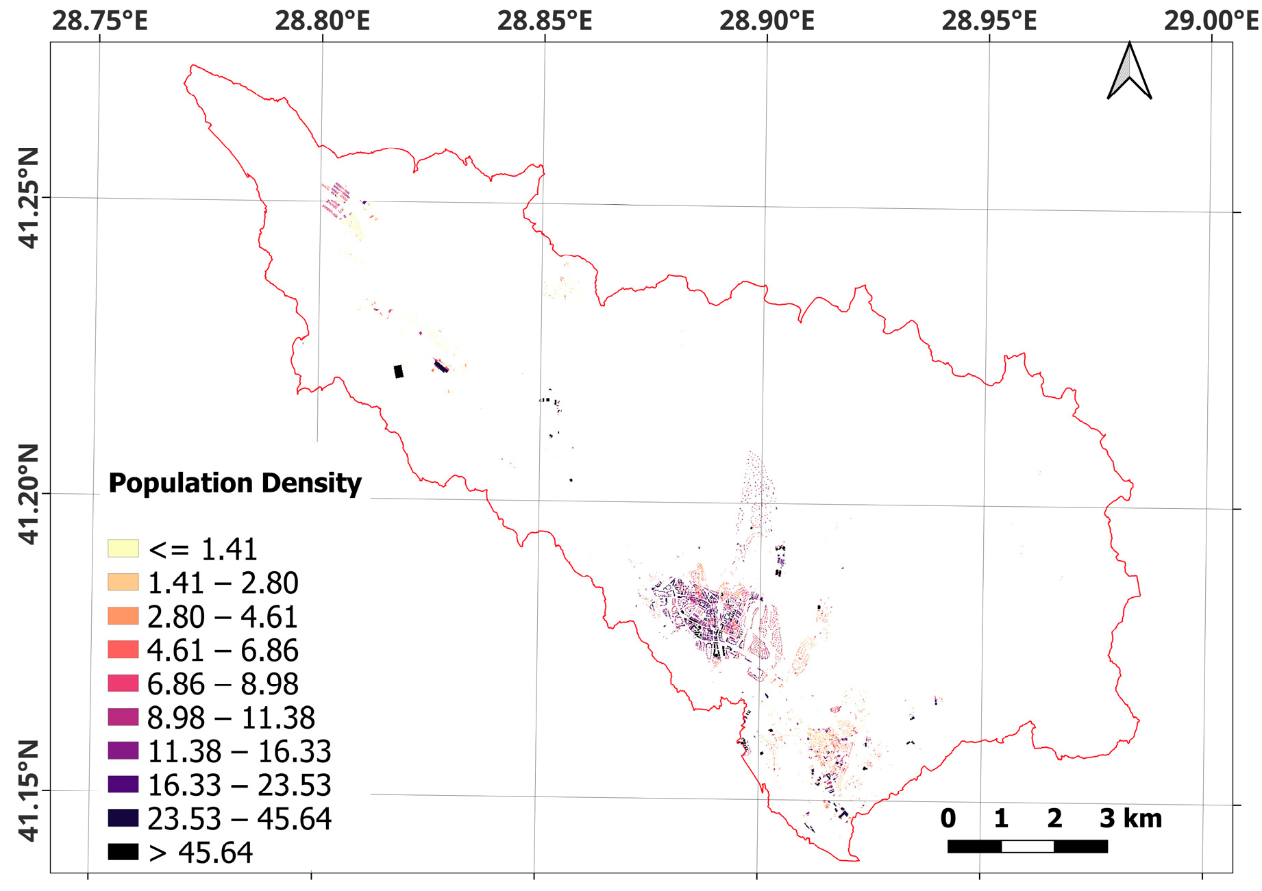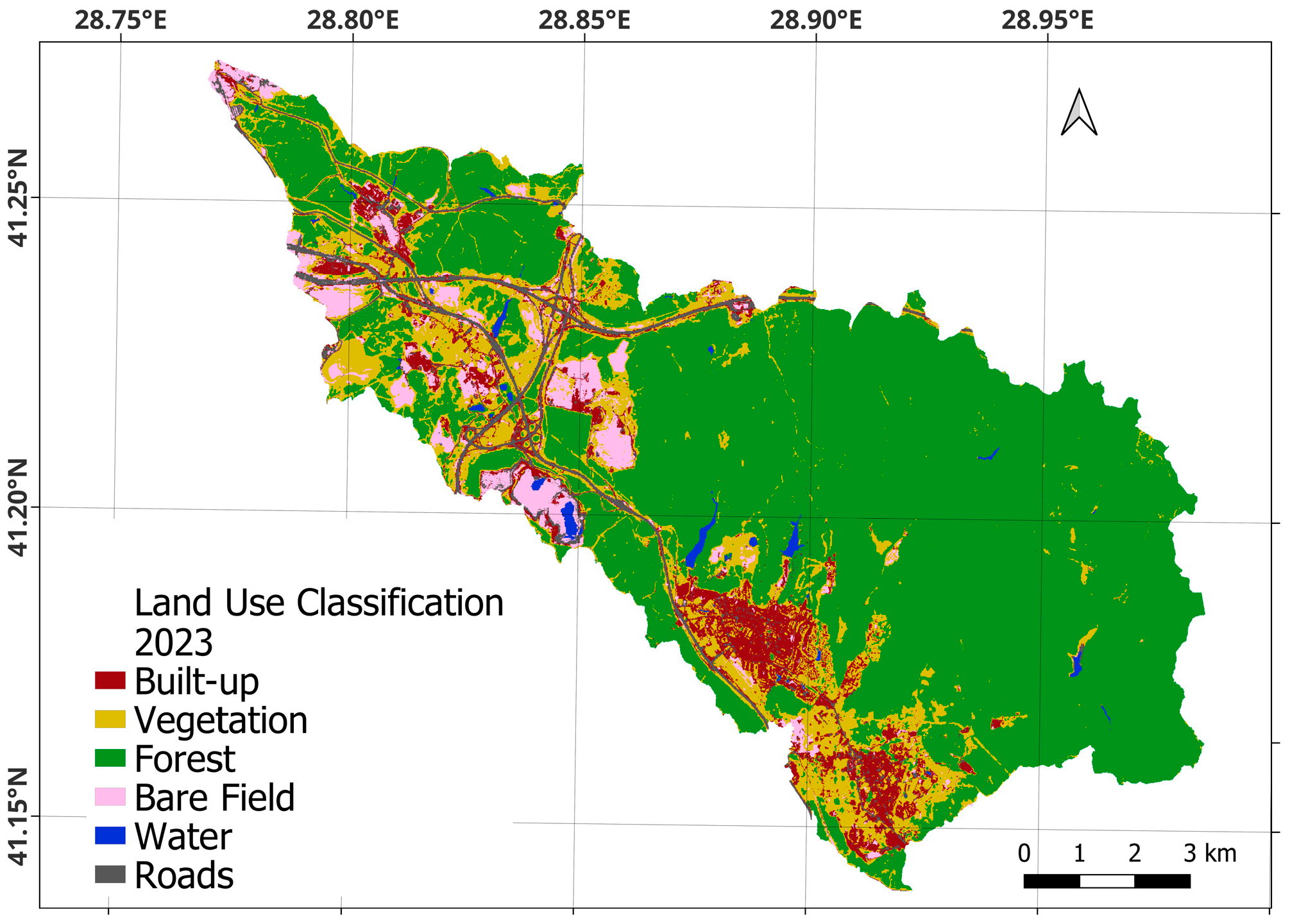 More than 55% of the world population already lives in cities, and current trends indicate that by 2050, this percentage will have risen to around 70%. This projection highlights the rapid growth of cities worldwide and the rising concentration of people within them [1,2]. Significant environmental problems, such as erosion, air pollution, global warming, and diminishing water resources, can result from rapid urban and industrial expansion combined with population increase. These changes have the potential to lead to major shifts in land use and land cover. In the study area, the Kağıthane basin in Istanbul, the combined population of the settlements of Göktürk, İhsaniye, Işıklar, Mimar Sinan, Mithatpaşa, and Odayeri has increased by about 16.59% over the past decade [3]. This clearly indicates potential for future land use changes within the study region.